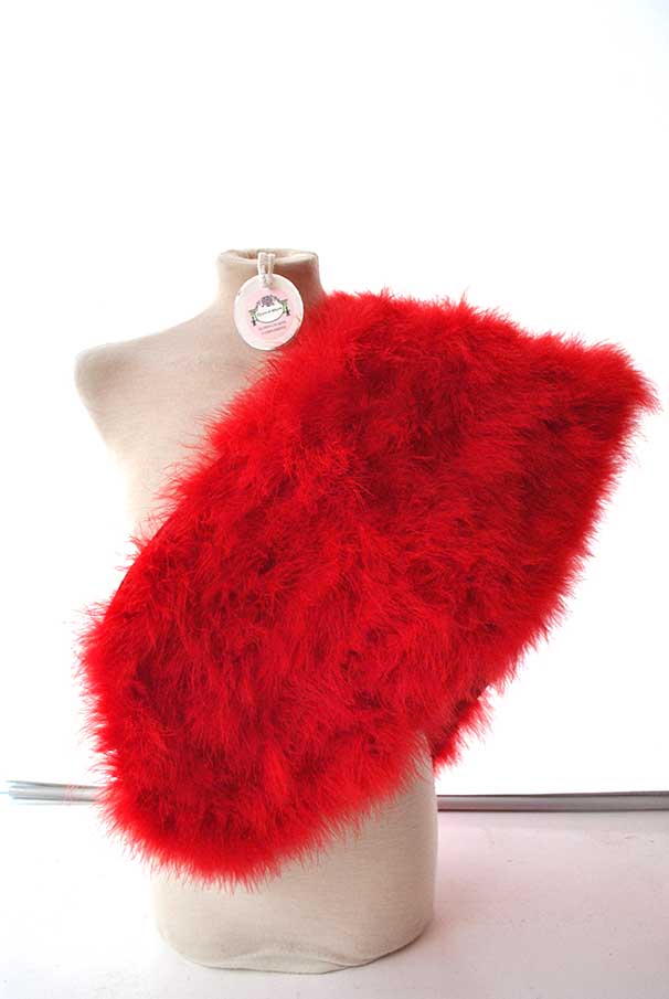 Capa o estola roja de fiesta, ideal para bodas y eventos especiales, fabricada a base de plumas naturales de avestruz en un llamativo color rojo. Se puede llevar de hombro o bien, cruzada hacia un lado o bien recta a modo de capa. La estola consta del interior está forrado, es muy favorecedora por su vaporoso movimiento y cómoda de llevar. Dispone de dos pequeños broches para llevarla abrochada si así lo deseemos.