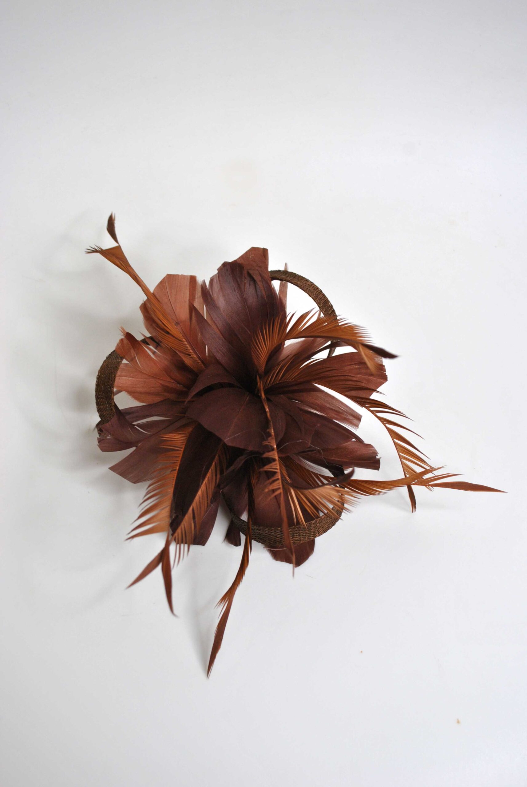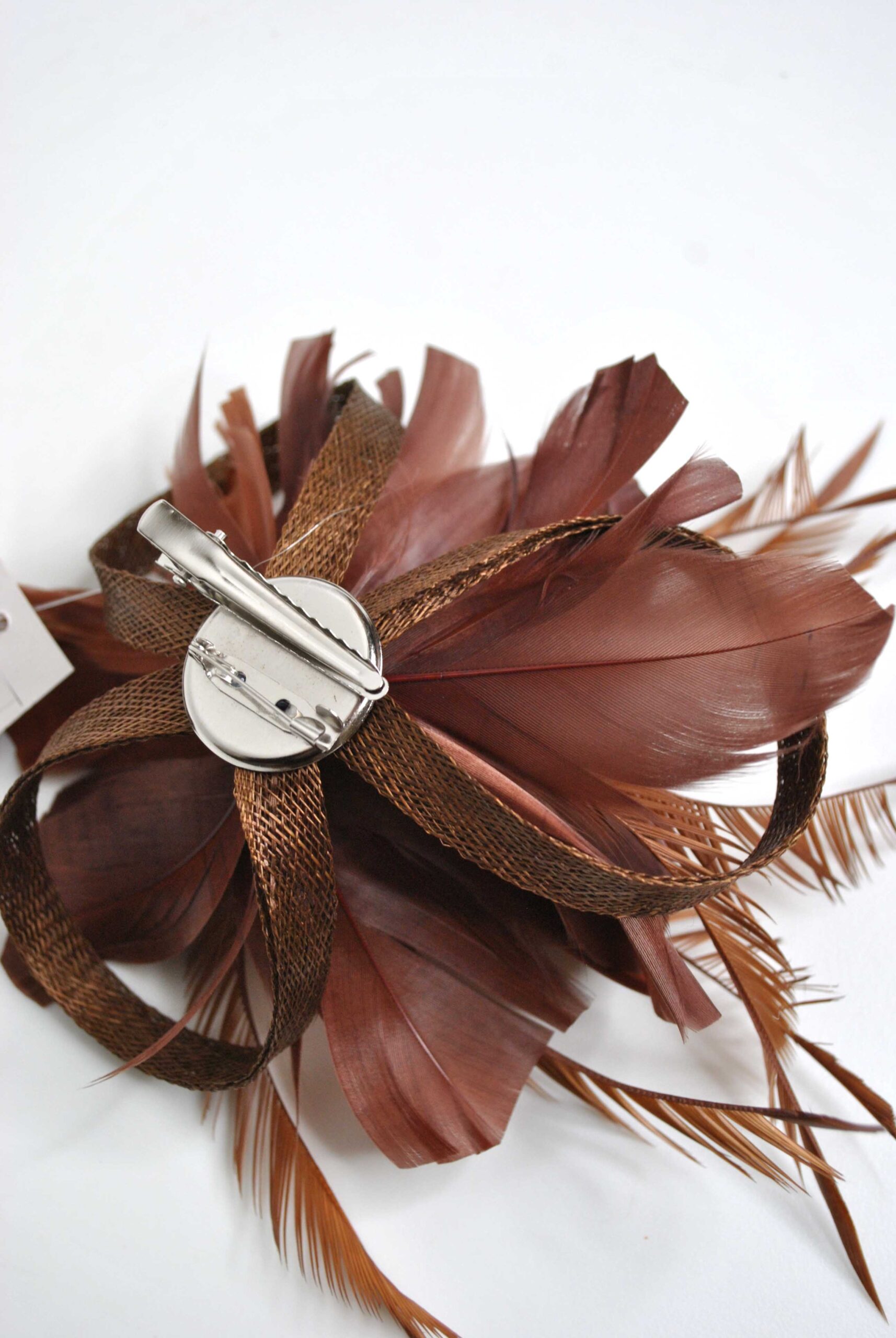 R21/4106 -Preciosa flor o tocado de pequeño tamaño, ideal para lucirlo en bodas, confeccionado en color marrón chocolate, sencillo y elegante a la vez, con el diseño en forma de flor con los pétalos abiertos decorados con finas y delicadas plumitas vaporosas dando originalidad y movimiento a este precioso accesorio para su vestido de fiesta o noche. Además, lleva una pinza e imperdible para que pueda ponerlo tanto en el cabello como en una prenda de vestir a modo de broche.