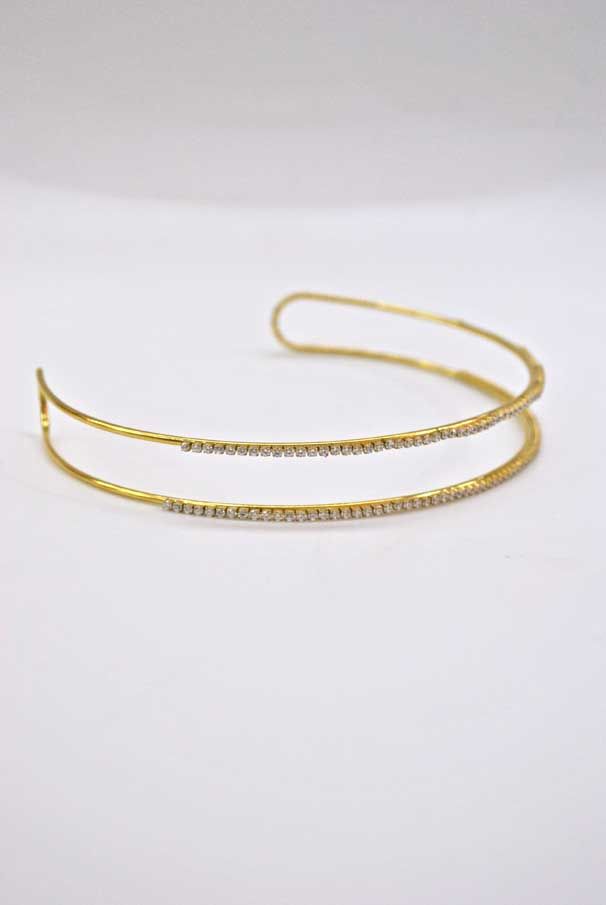 R02/4785 – Bonita y original gargantilla de fiesta. Se trata de una gargantilla choker fabricada en acero inoxidable dorado y decorada con pequeños brillantes blancos.