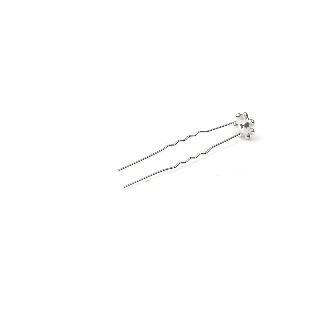 R03/HREF – Horquilla de fiesta fabricada en metal ligero plateado y decorada con una flor mostaza también de metal y pequeños cristales blancos.