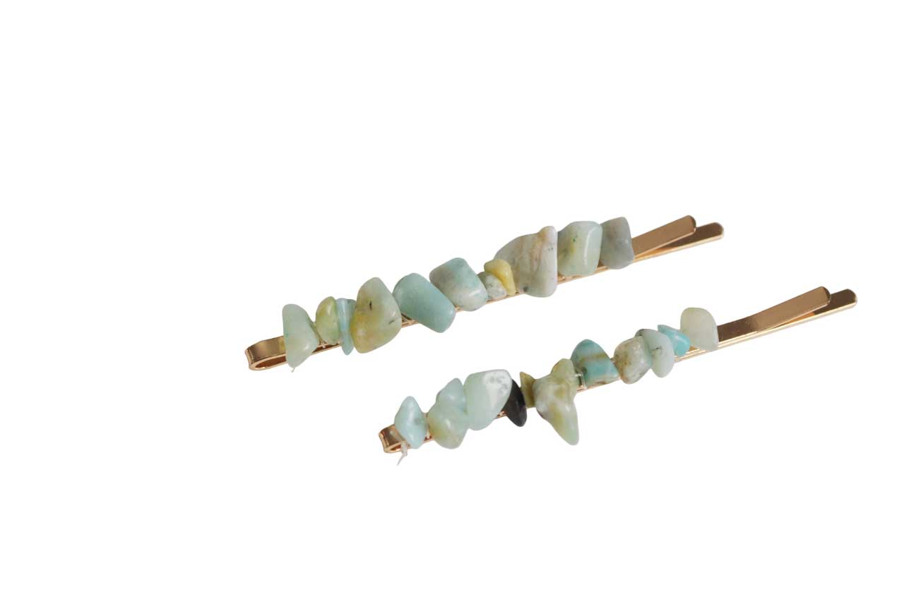 R04/5500 – Bonito pack de horquillas doradas decoradas con piedras de resina en color verde menta o verde agua.