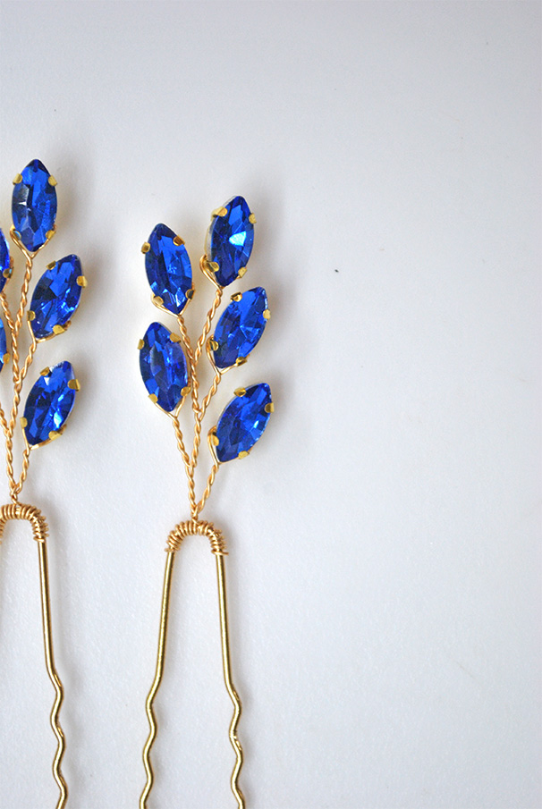 R03/HQC – Bonito y elegante conjunto de 3 horquillas de fiesta. Se tratan de 3 horquillas fabricadas en metal ligero dorado y decoradas con pequeños cristales azules eléctricos. Ideal para colocarlas en recogidos o semirecogidos.