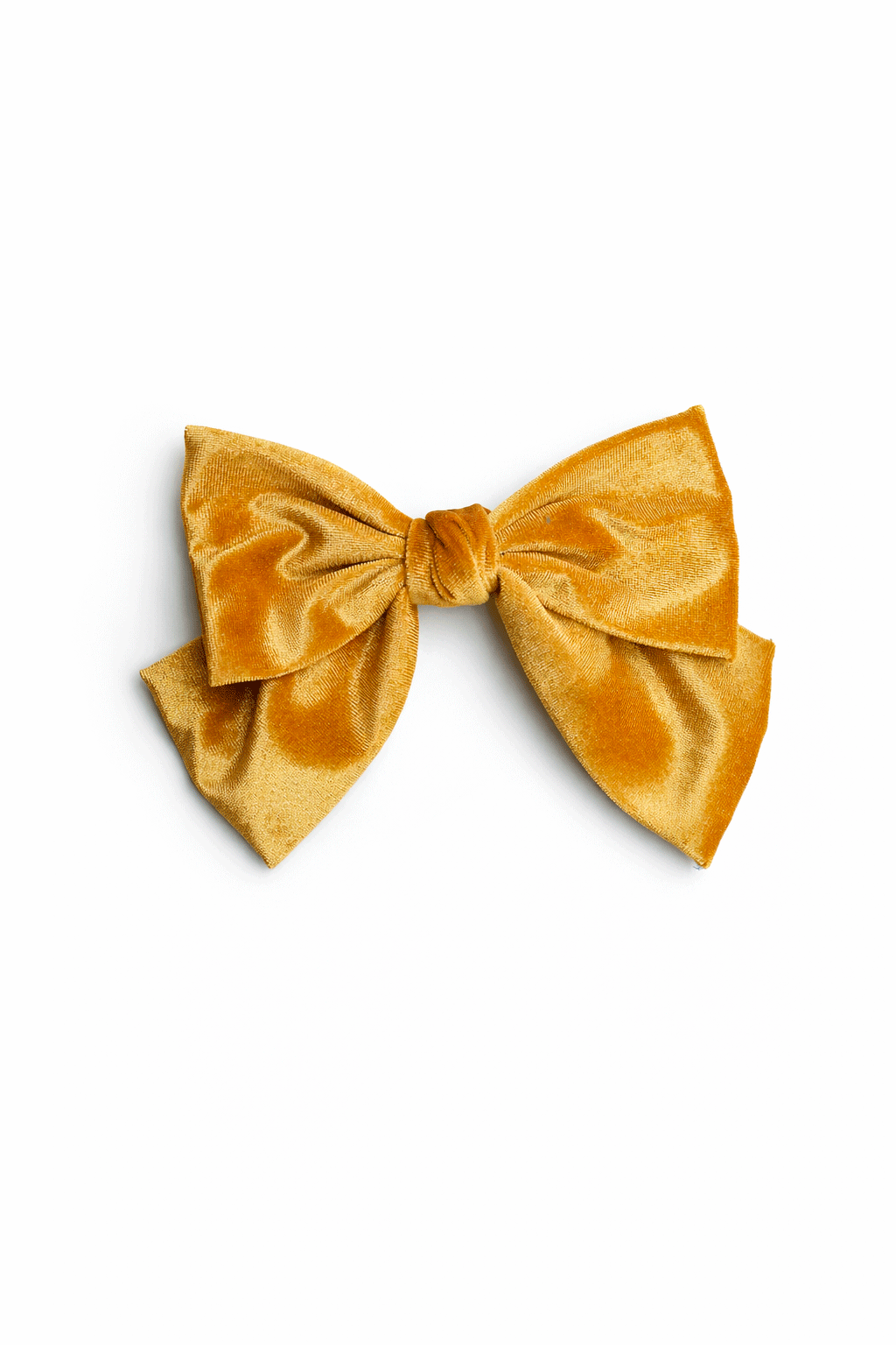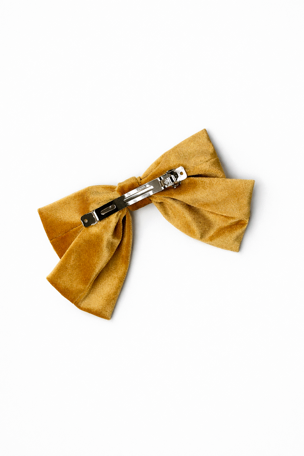 REF: 035896 – Precioso lazo confeccionado en suave terciopelo color mostaza, con una caída elegante y acabado aterciopelado que aporta profundidad y sofisticación al conjunto. Su diseño clásico, de inspiración romántica, lo convierte en un complemento atemporal perfecto para realzar peinados tanto formales como informales.