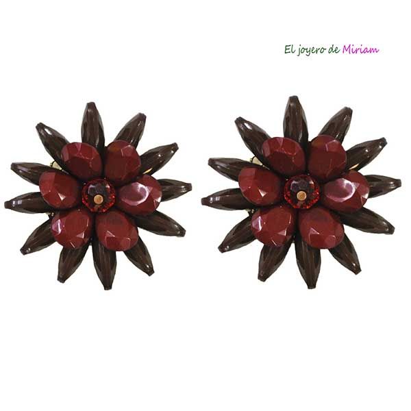 R02/4897 – Maxi pendientes de mujer diseñados en forma de flor. Se tratan de unos pendientes realizados en resina combinada en tono burdeos con marrón. Constan de cierre a presión.