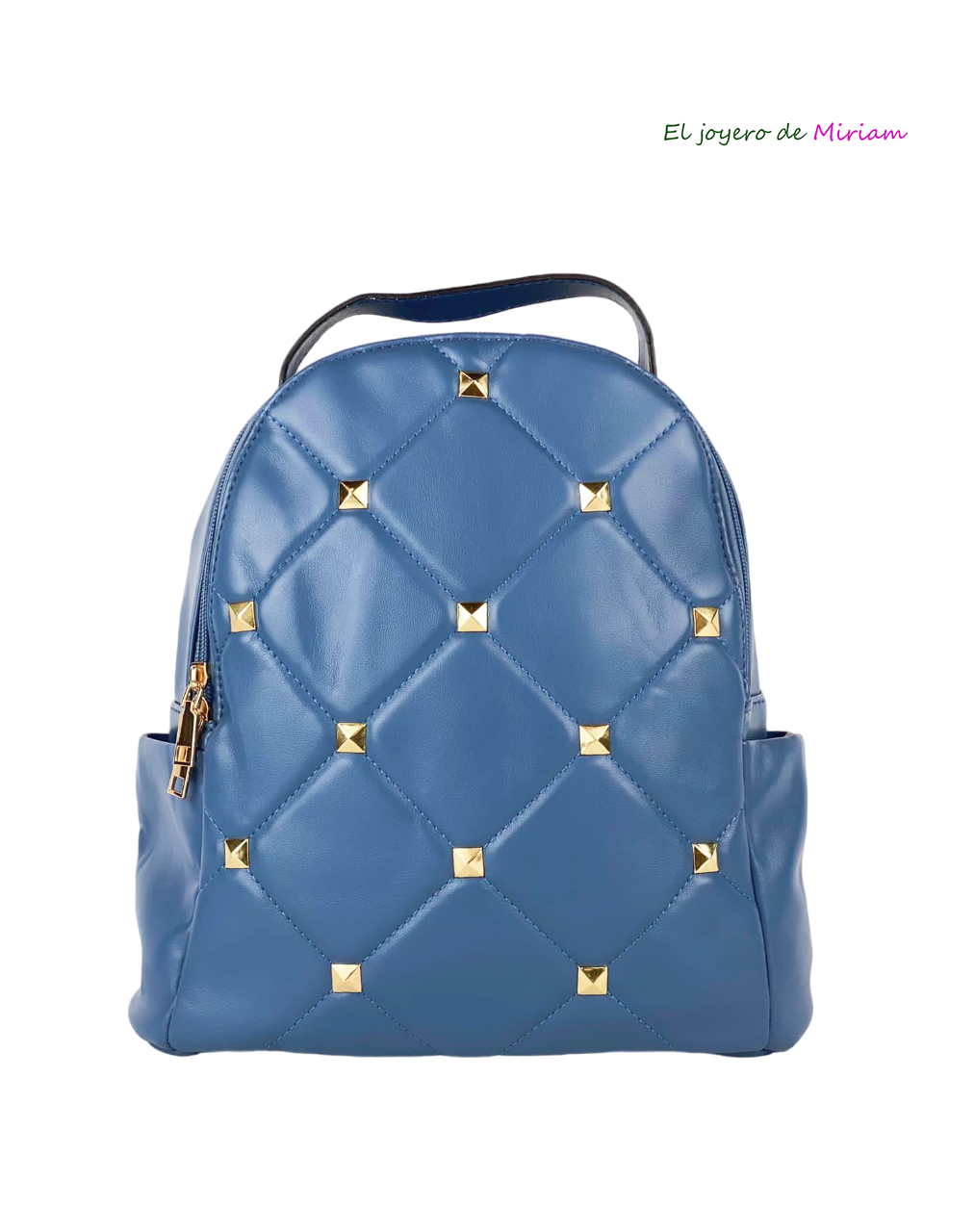 R04/5472 – Preciosa mochila azul acolchada. Se trata de una mochila de polipiel muy suave decorada con tachuelas doradas. Presenta una cremallera central, bolsillos laterales y asas autoajustables.