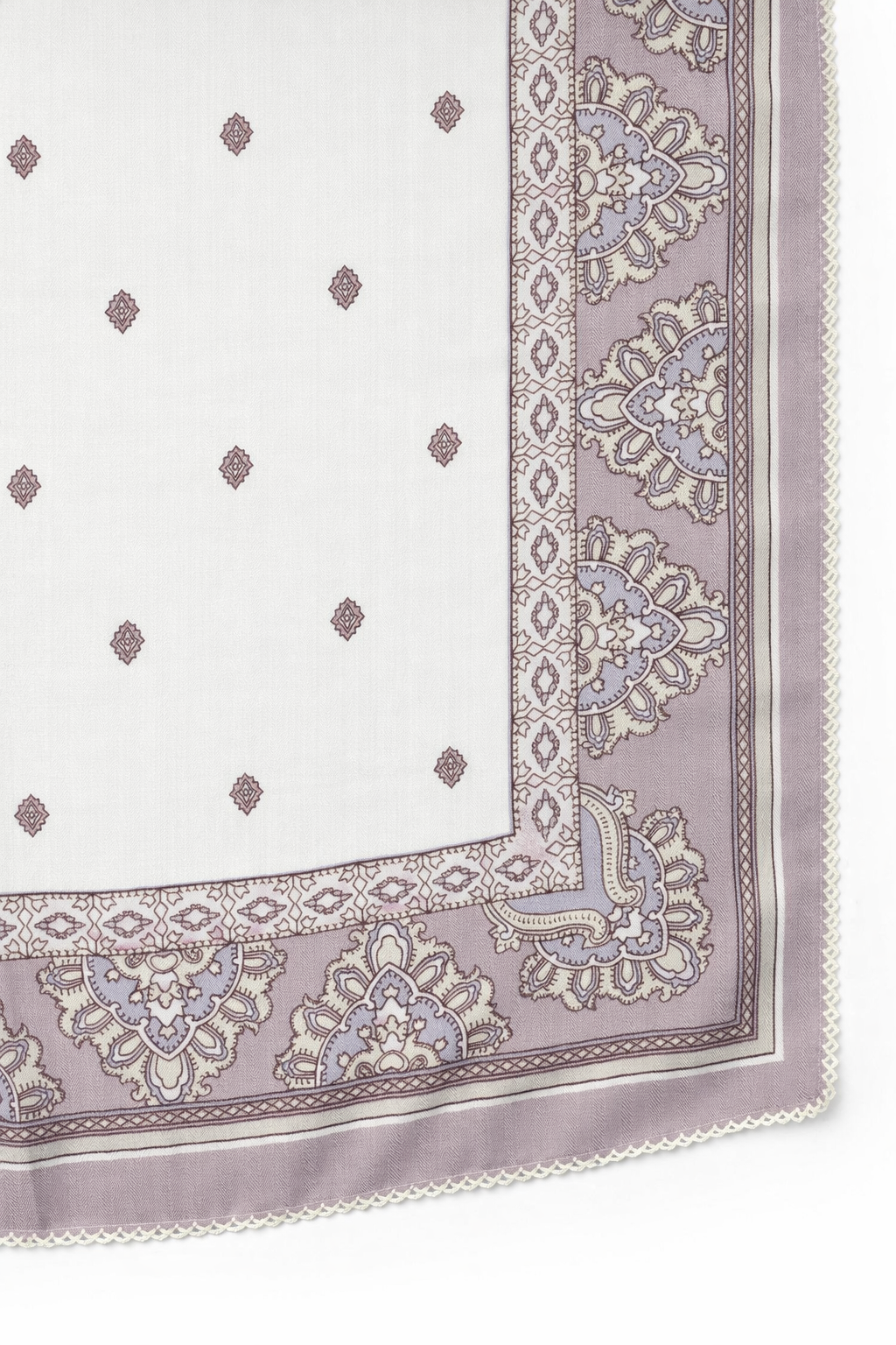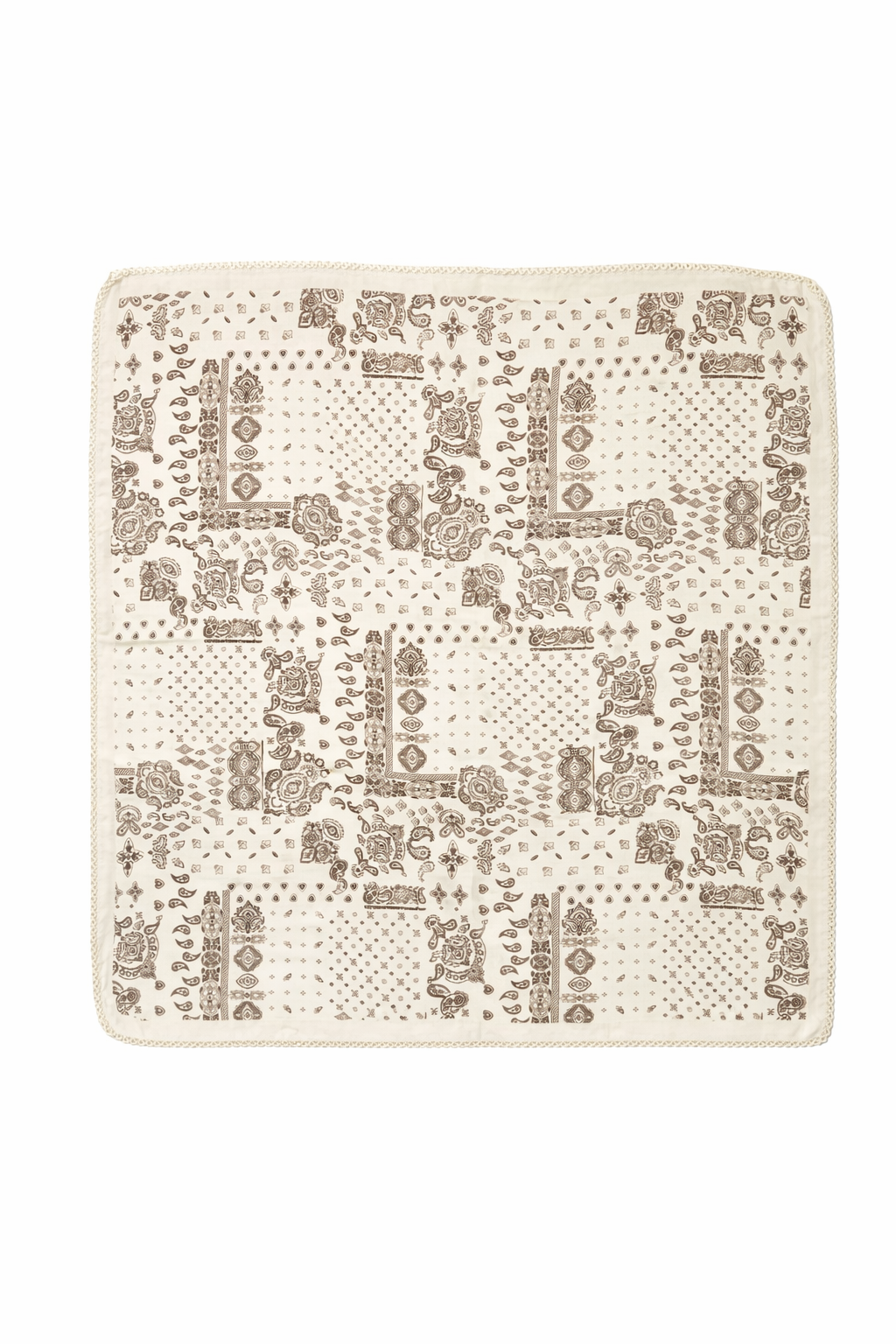 REF: 3568 – Pañuelo elegante en tono beige suave con estampado ornamental en marrón tierra de inspiración clásica. Su diseño combina pequeños motivos geométricos y detalles decorativos que crean un efecto sofisticado y muy combinable. El acabado con borde delicado aporta un toque cuidado y femenino. Ideal para llevar al cuello, en el bolso o incluso como complemento en el cabello. Un básico atemporal perfecto para dar estilo sin recargar el look.