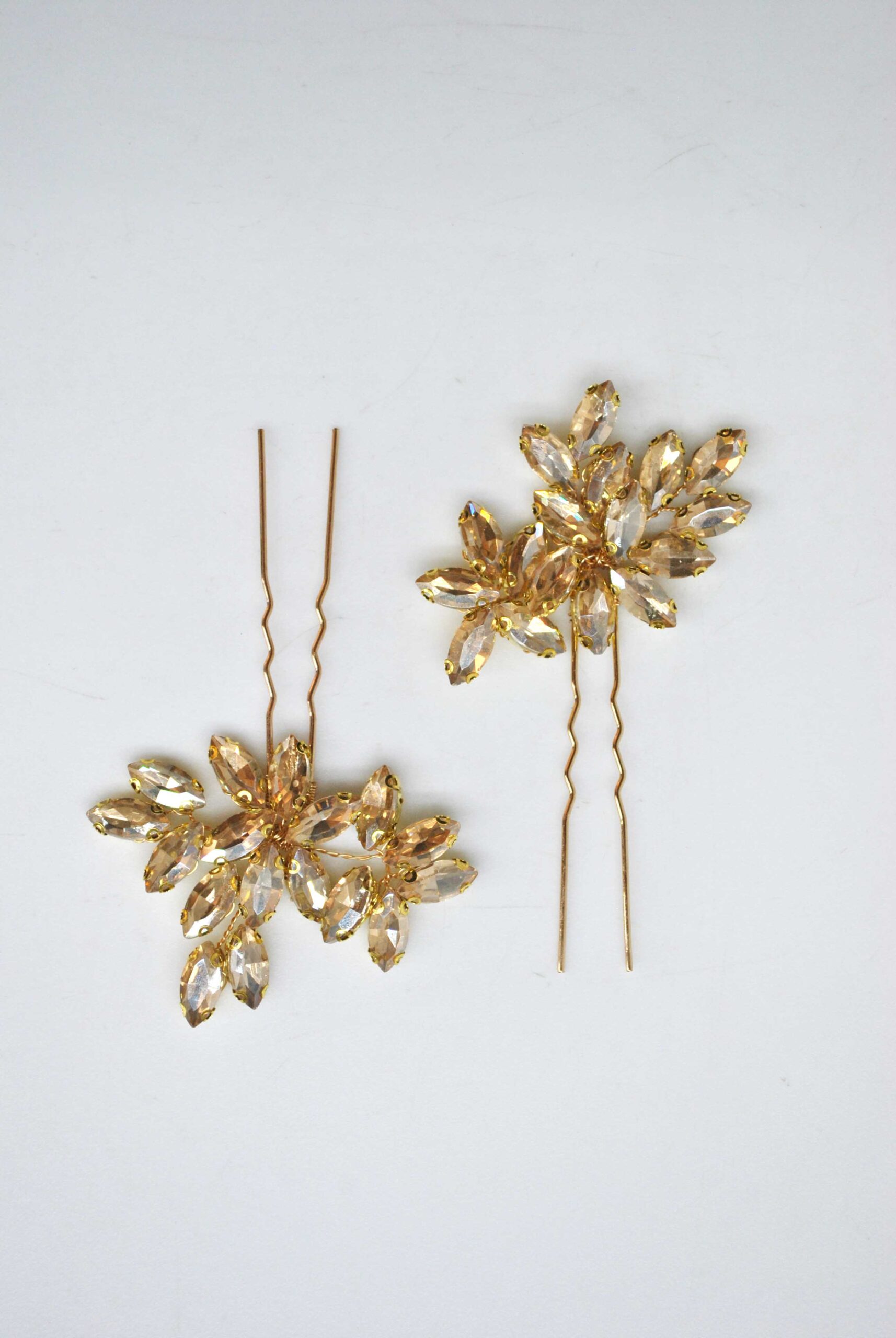 REF: LA- 35080 – Preciosa pareja de horquillas de fiesta. Están fabricadas en metal ligero dorado y presentan flores decoradas con cristales en tono dorado.