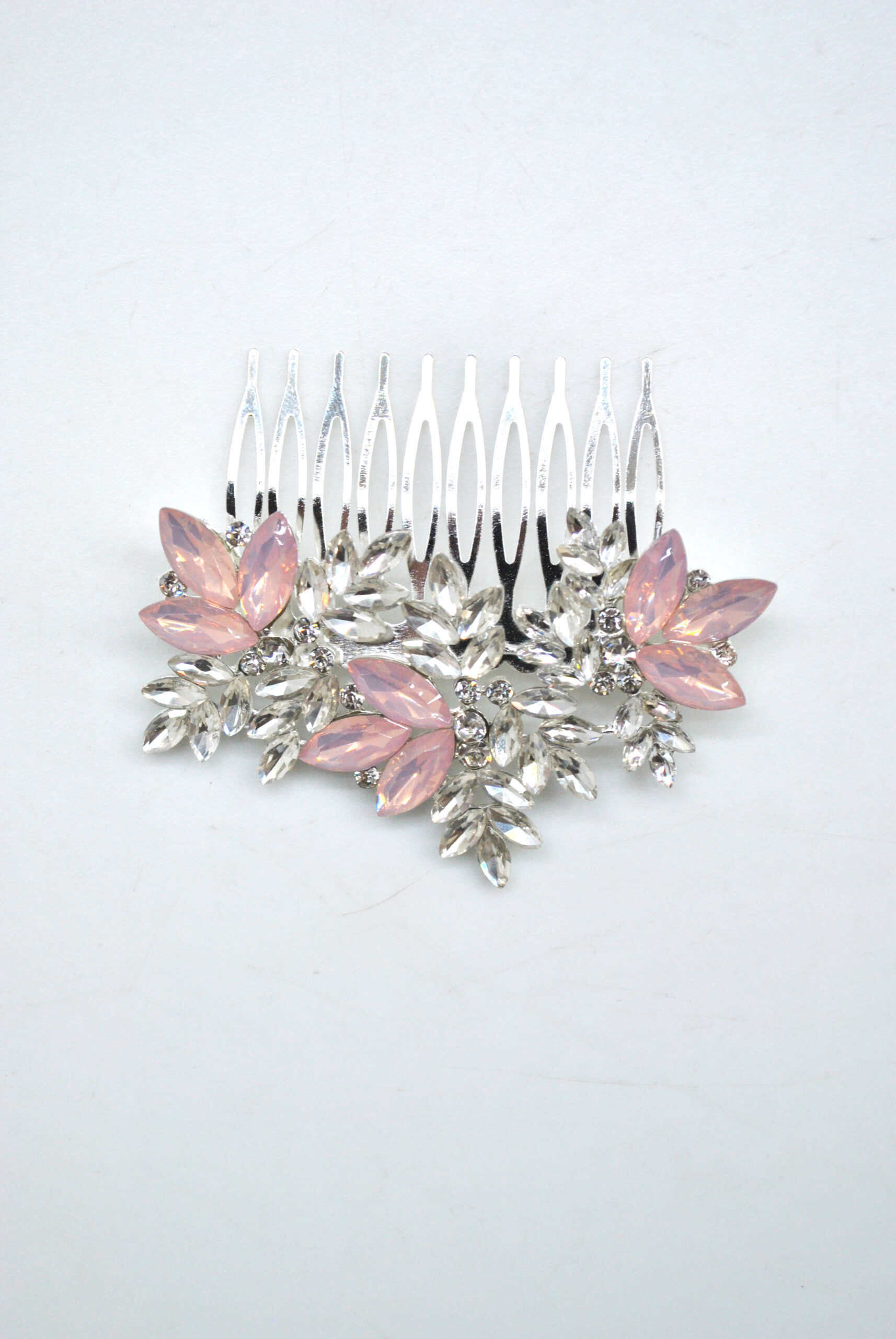 REF: AD- 5328 – Preciosa peineta de fiesta color rosa nude y plata. Se trata de una peineta fabricada en metal ligero plateado y decorada con cristales diseñados en forma de hojas y flores combinadas en tonos blancos y rosas nude, muy atractiva y elegante.