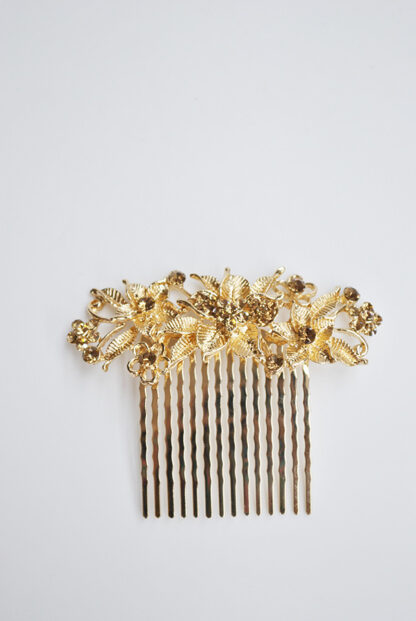 R03/5328 – Elegante peineta de fiesta dorada, ideal para recogidos y semirecogidos. Se trata de una peineta fabricada en metal ligero dorado y está decorada con pequeñas flores y cristales dorados.