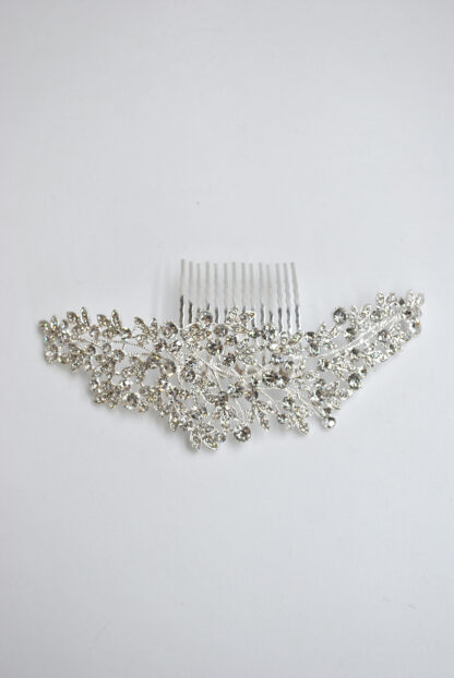 R03/5053 – Original tocado o peineta plateada de fiesta fabricada en metal ligero plateado y decorado con elegantes cristales blancos formando hojas y flores. Ideal para recogidos y semirecogidos y que luzcas como la novia o invitada perfecta.