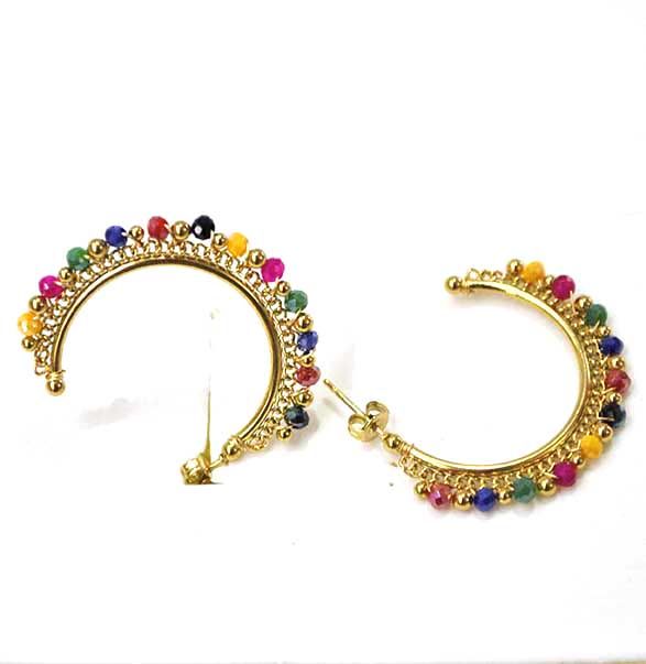 R03/4967 – Bonitos, elegantes y originales pendientes de aro. Se tratan de unos aros fabricados en acero inoxidable dorado. Además, presentan pequeñas cuentas multicolor.