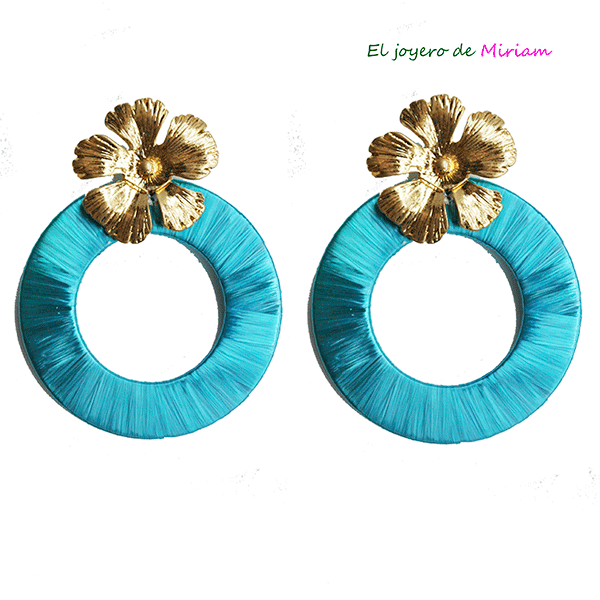 R03/5164 – Preciosos pendientes turquesas. Se tratan de unos pendientes montados sobre bisutería dorada, diseñados en forma de aro y forrados con tela brillante turquesa. Además en la parte superior presenta una flor dorada de metal ligero.