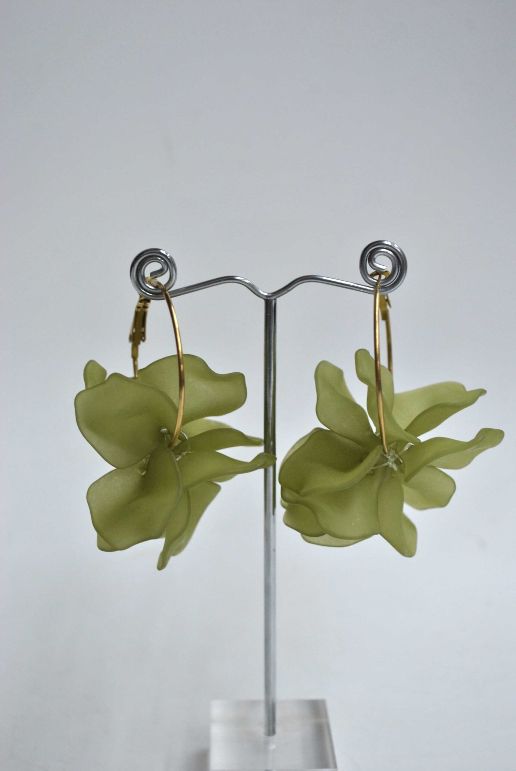 REF: 5167 – Bonitos pendientes de acero inoxidable dorado. Presentan diseño de aro y están decorados con pétalos de resina verdes.