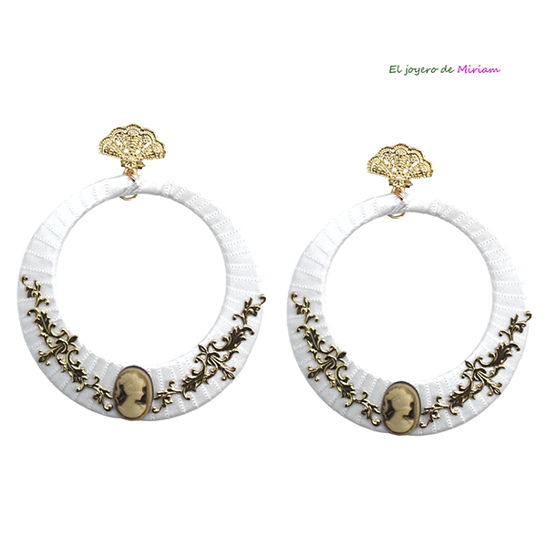 R04/5322 – Preciosos pendientes blancos de flamenca. Se tratan de unos pendientes diseñados en forma redonda y forrados con tela brillante blanca. Están montados sobre bisutería dorada y presentan decoraciones doradas vegetales y camafeos. Cierre omega.