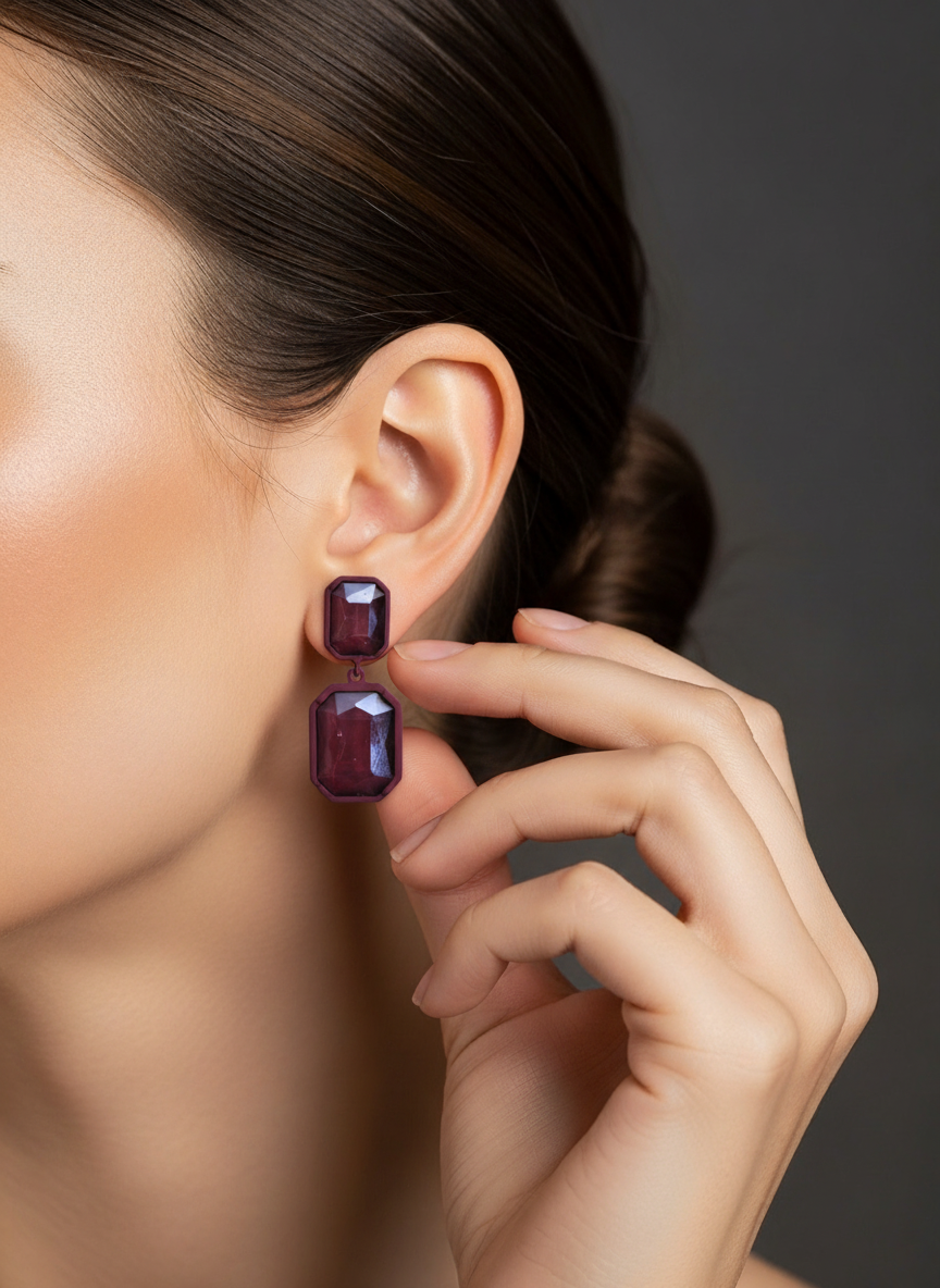 REF: 58222 – Pendientes largos de diseño sofisticado formados por dos piezas rectangulares de cristal facetado en intenso tono burdeos. Su estructura geométrica aporta un estilo contemporáneo y elegante, mientras que el acabado facetado capta la luz con delicados reflejos, realzando el rostro. Un complemento ideal para invitadas, eventos especiales o looks de noche.