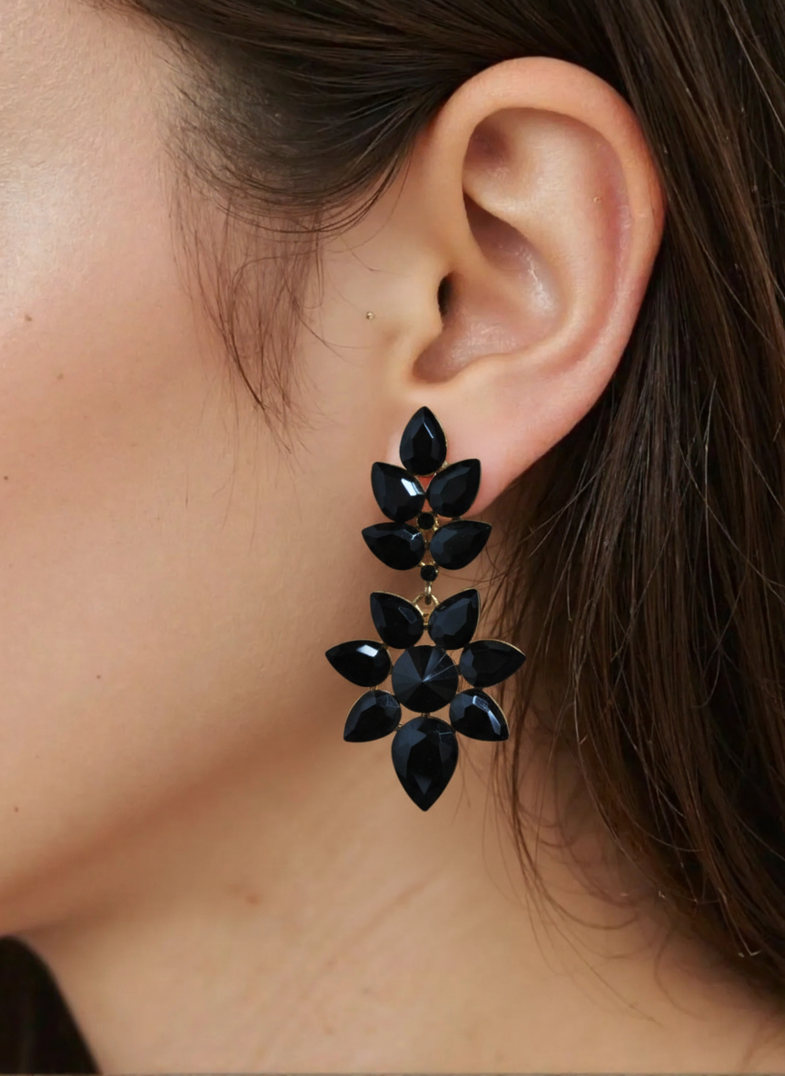 VV092445796 – Espectaculares pendientes azul noche largos de fiesta. Se tratan de unos pendientes montados sobre bisutería dorada, diseñados en forma de flor alargada y decorados con cristales azules oscuros.