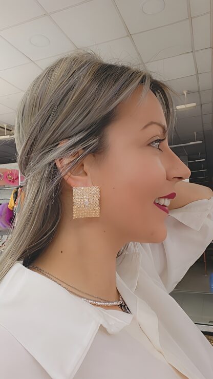 R19/3041 -Originales y estilosos pendientes dorados de mujer. Se tratan de unos pendientes rectangulares, pegados a la oreja y decorados con pequeños cristales blancos. Muy cómodos de llevar ya que apenas pesan. Además, presentan cierre a presión.
