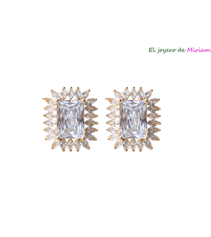R04/5533 – Elegantes pendientes dorados de fiesta. Se tratan de unos pendientes montados sobre bisutería dorada y presentan un cristal blanco rectangular y cristales blancos más pequeños alrededor del mismo.