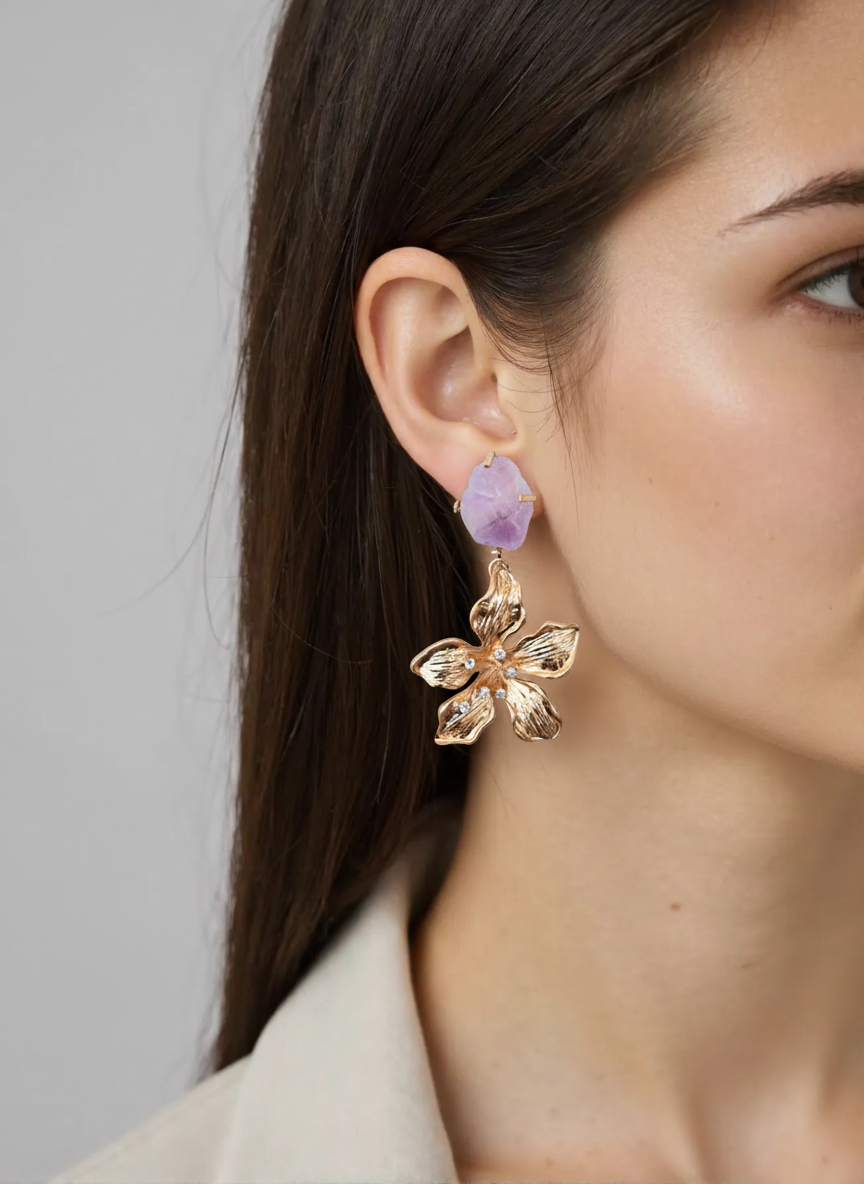 REF: 56034 – Preciosos pendientes que combinan la elegancia de una piedra lila natural de forma irregular con el encanto de una flor metálica dorada. La flor, de textura orgánica y acabados brillantes, cuenta con pequeños cristales en el centro que aportan un toque de luz y sofisticación. El contraste entre el tono suave de la piedra y el dorado intenso crea una pieza armoniosa y atractiva. Perfectos para eventos especiales, cenas o celebraciones, estos aretes son una opción ideal para realzar cualquier look con un toque lleno de personalidad. Constan de cierre a presión.