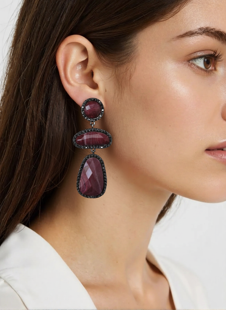 REF: 35104 – Pendientes largos de diseño elegante y sofisticado, compuestos por tres piezas articuladas con piedras facetadas en profundo tono burdeos, que aportan brillo y profundidad visual. Cada elemento está delicadamente enmarcado por un borde de acabado plata envejecida con pequeños cristales, creando un contraste refinado y muy favorecedor.