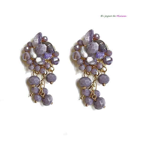 R03/5090 – Preciosos pendientes morados de mujer. Se tratan de unos pendientes alargados, decorados con cuentas y con elegantes piedras moradas. Constan de cierre a presión.