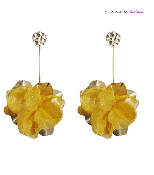 R04/5560 – Originales pendientes largos mostaza. Se tratan de unos pendientes montados sobre bisutería dorada y decorados con una flor de metal dorado y pétalos mostaza.