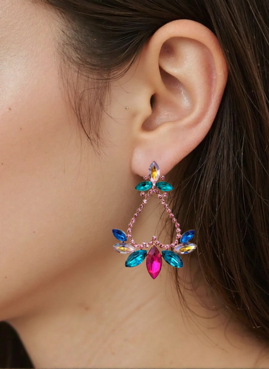 REF: 46031 – Elegantes pendientes de fiesta multicolor. Presentan un diseño triangular formado por pequeñas piedras rosadas que delinean la estructura principal. Cada vértice está adornado con cristales de forma marquise en una vibrante combinación de colores: fucsia, azul, verde esmeralda, dorado y violeta. En el centro inferior destaca una piedra fucsia más grande, que actúa como punto focal y aporta un toque elegante y glamuroso.