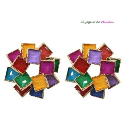 R04/5498 – Preciosos pendientes multicolor de fiesta. Se tratan de unos pendientes decorados con pequeños cristales rectangulares y quedan pegados a la oreja. Están montados sobre bisutería dorada y constan de cierre a presión.