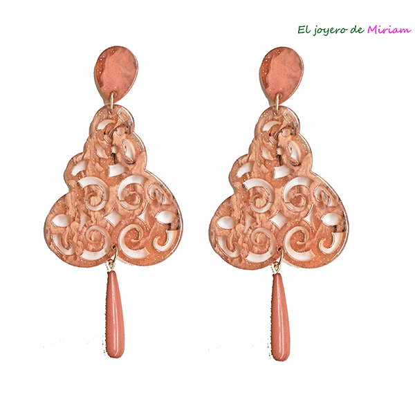 R03/5165 – Bonitos y originales pendientes largos. Se tratan de unos pendientes rosa nude fabricados en resina esmaltada con ligeros y elegantes brillos. De estilo flamenca y muy cómodos de llevar ya que no pesan nada. Constan de cierre a presión.