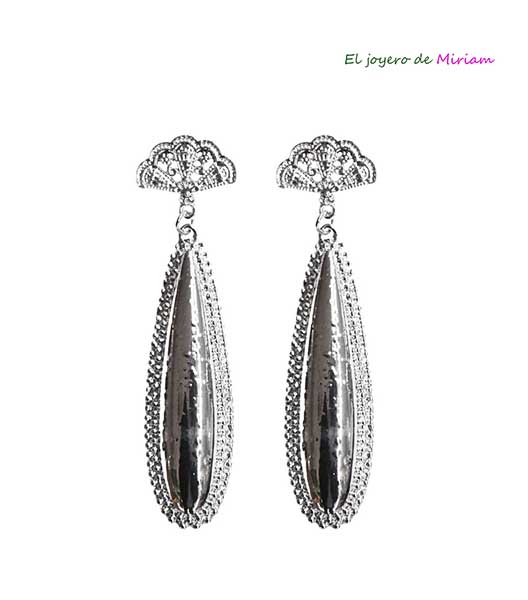R04/5509 – Bonitos pendientes plateados de flamenca. Se tratan de unos pendientes largos de flamenca fabricados en metal ligero plateado y decorados con un abanico en la parte superior. Muy cómodos de llevar.