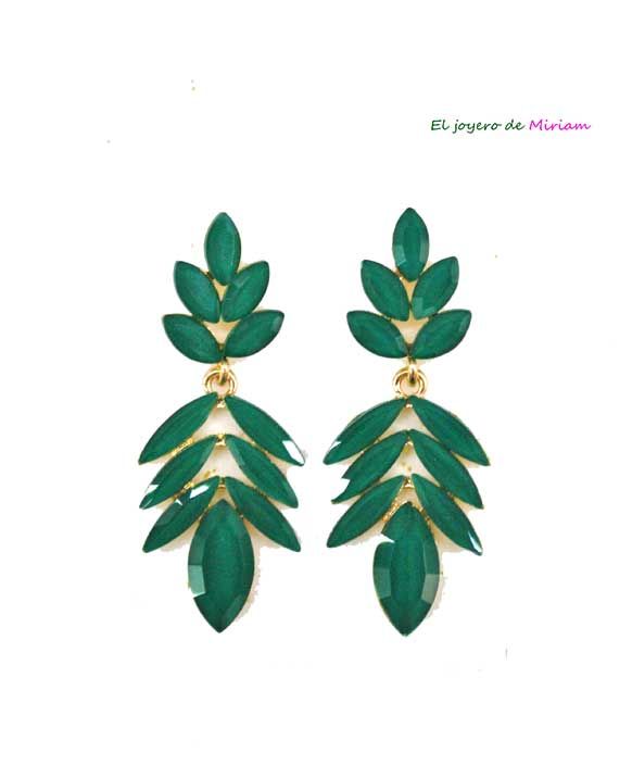 R02/4825 – Preciosos pendientes naranjas de fiesta. Se tratan de unos pendientes montados sobre bisutería dorada y, decorados con cristales verdes diseñados en formas de hojas. Constan de cierre a presión.