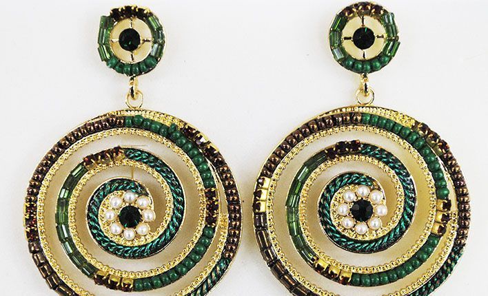 Originales pendientes largos de estilo hindú – boho chic. Se tratan de unos pendientes fabricados en metal ligero dorado y decorados con cuentas y lágrimas de cuentas verdes combinadas con tonos marrones. Además en la parte central presentan pequeñas perlas flanqueando un pequeño cristal verde.