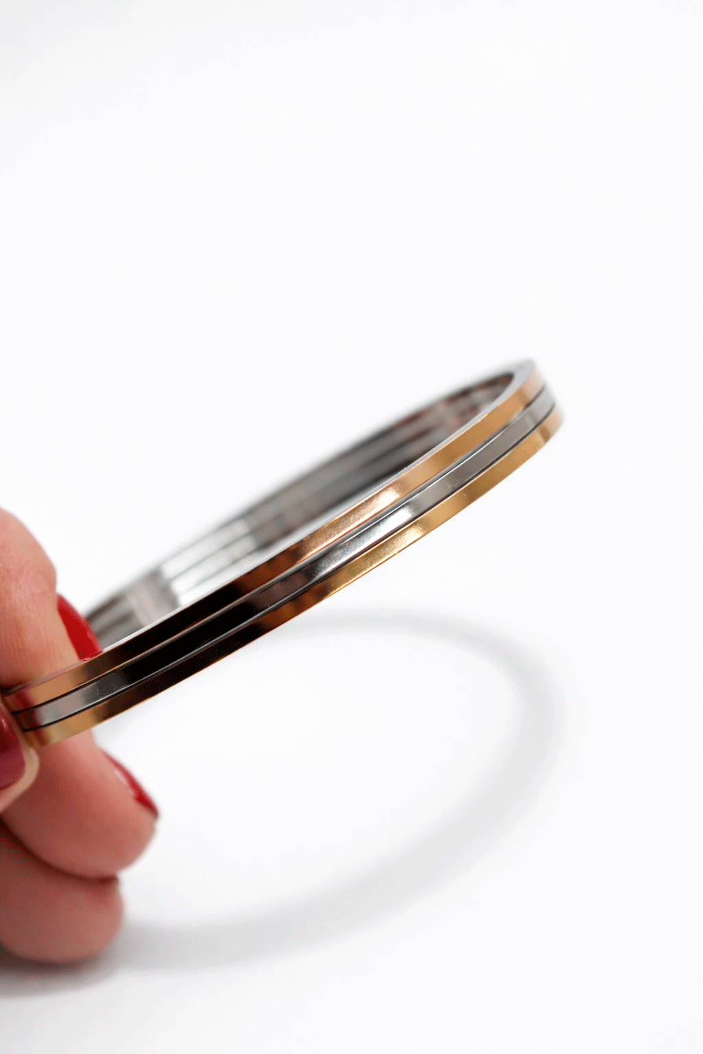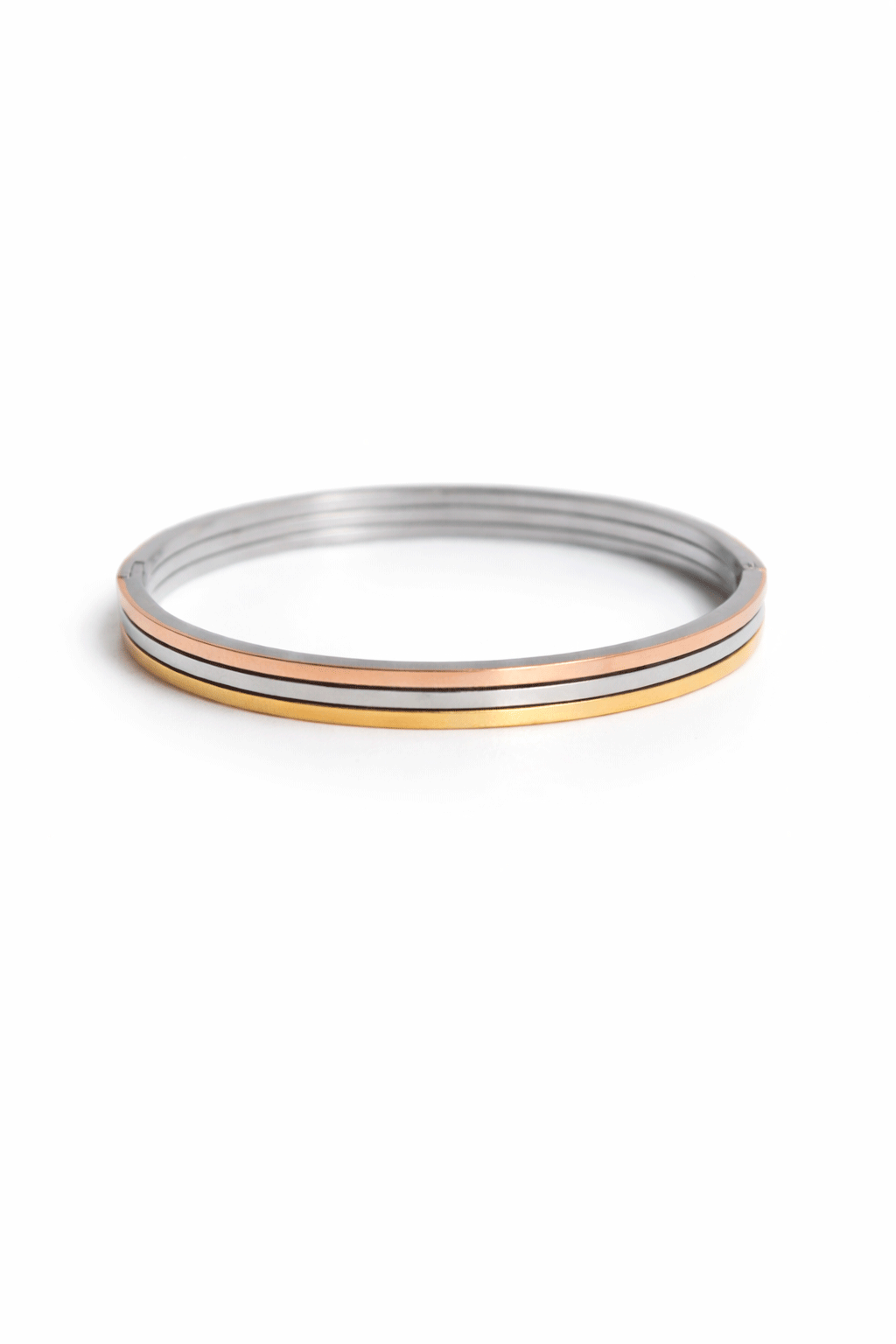 REF: 408890 – Pulsera rígida de diseño elegante y minimalista realizada en acero inoxidable. Está compuesta por finas bandas en tres tonos metálicos: plateado, dorado y oro rosa. Su acabado pulido aporta un brillo suave y sofisticado, ideal para quienes buscan una joya versátil y atemporal.