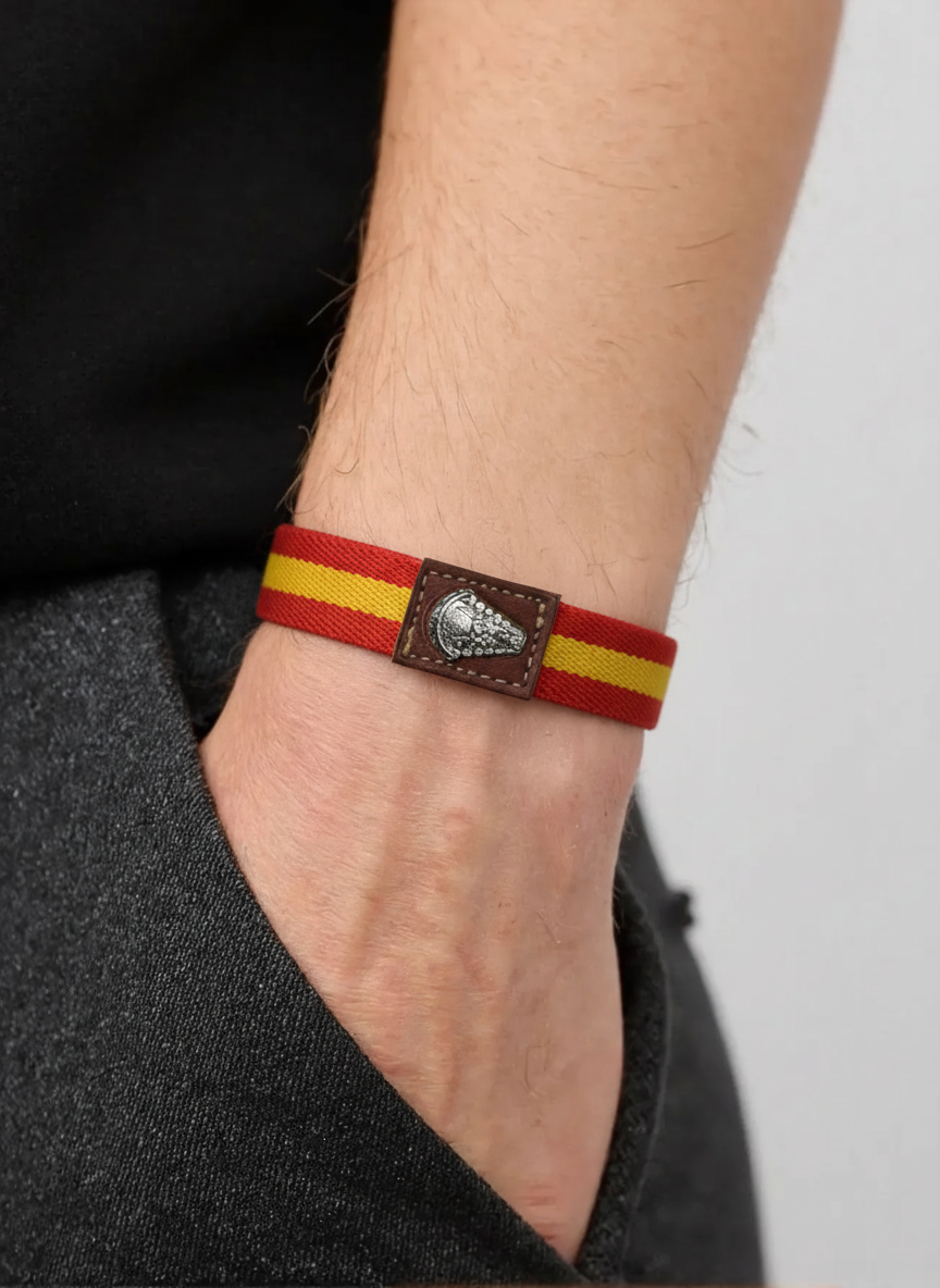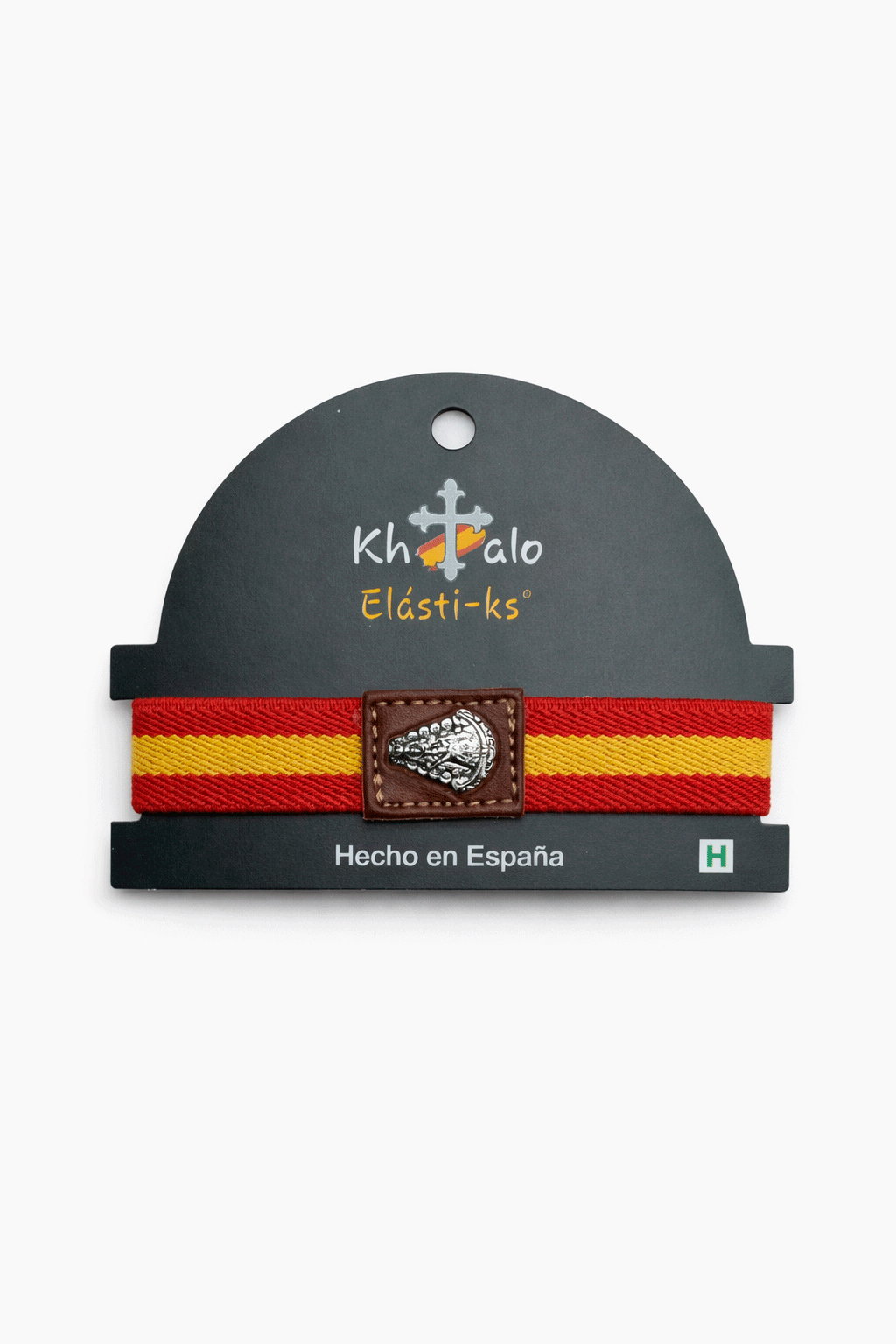 REF: 95583 – Pulsera de tela elástica con los colores de la bandera de España, confeccionada en cinta resistente de alta calidad. Incorpora un detalle central en piel marrón cosida a mano, rematada con el emblema de la Virgen del Rocio tono plateado en relieve.