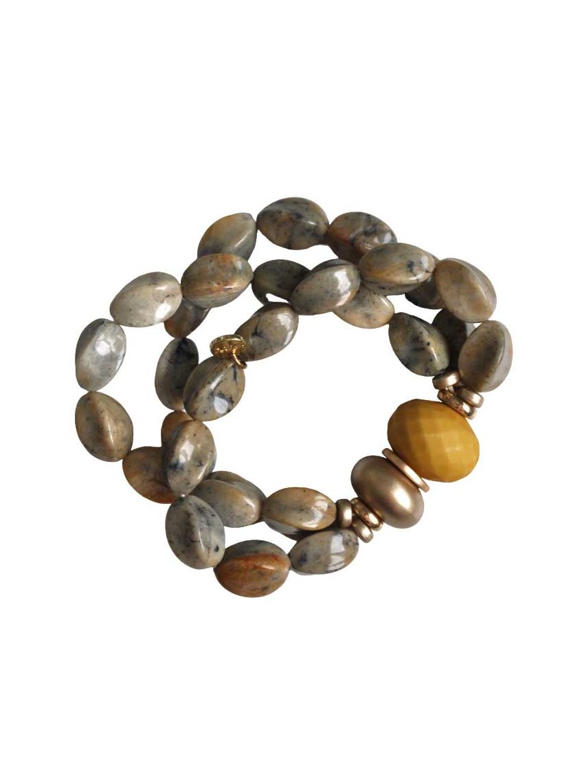 R04/5562 – Bonita pulsera triple elaborada con cuentas de resina en color marrón. Además destaca una cuenta en color mostaza.