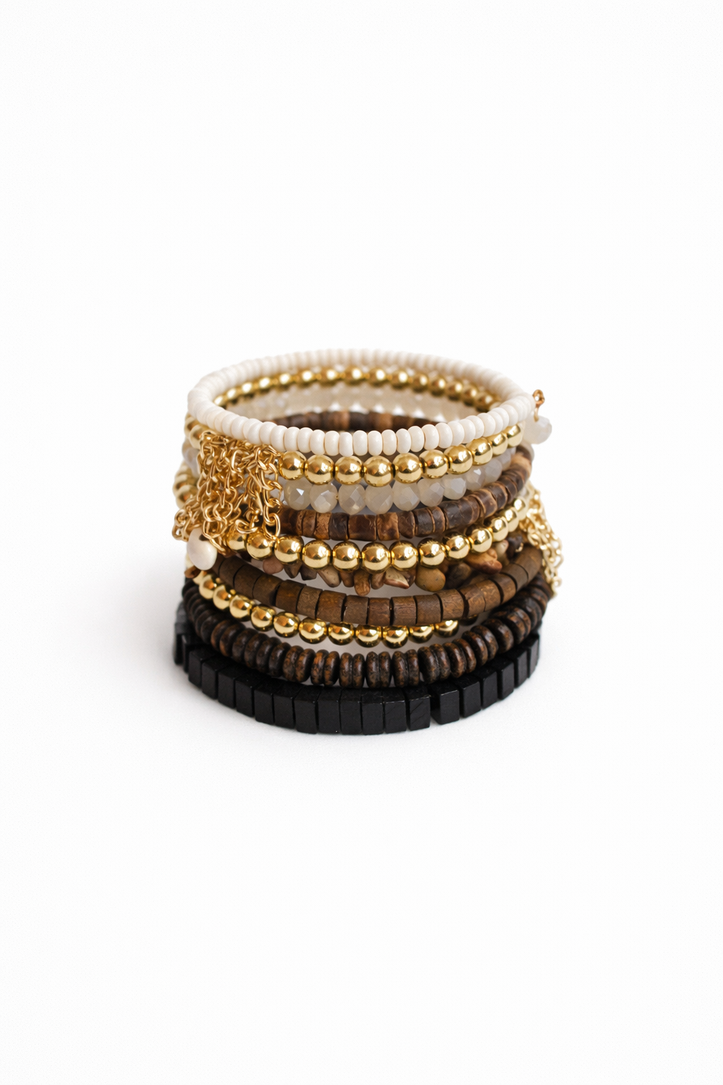 REF: 3684 – Pulsera múltiple estilo boho en una combinación elegante de tonos tierra, negro y detalles dorados que aportan luz y sofisticación. Incluye pulseras elásticas con cuentas de madera, piezas facetadas, bolas metálicas doradas y delicadas cadenas con pequeños colgantes que añaden movimiento y personalidad.