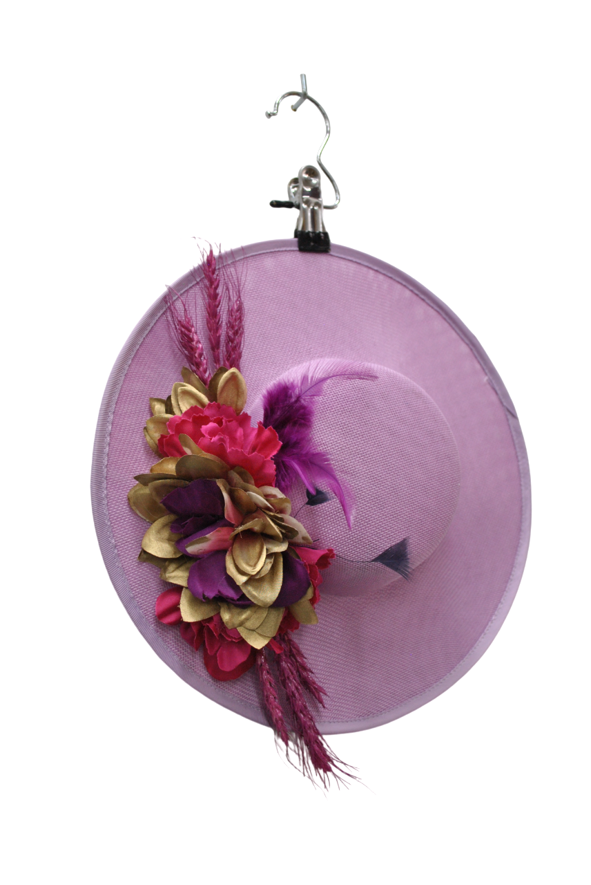 R04/5722 – Precioso tocado o canotier de fiesta malva. Se trata de un tocado con la base de color malva y decorado artesanalmente con pétalos de flores combinados en tonos dorados, rosas y morados. Además, destaca alguna que otra elegante pluma en color morado y, espigas en color fucsia. Lo puedes llevar cómodamente puesto gracias a su diadema o a su juego de horquillas que se adaptan perfectamente al pelo.