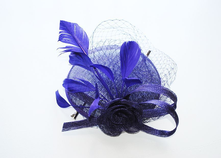 R18/1530 – Elegante tocado casquete, de fiesta, confeccionado en color MORADO CARDENAL, formando flores decorativas, plumas y redecilla del mismo color, quedando un diseño elegante y muy favorecedor. Dispone de dos pequeñas pinzas para sujetarlo cómodamente al pelo.