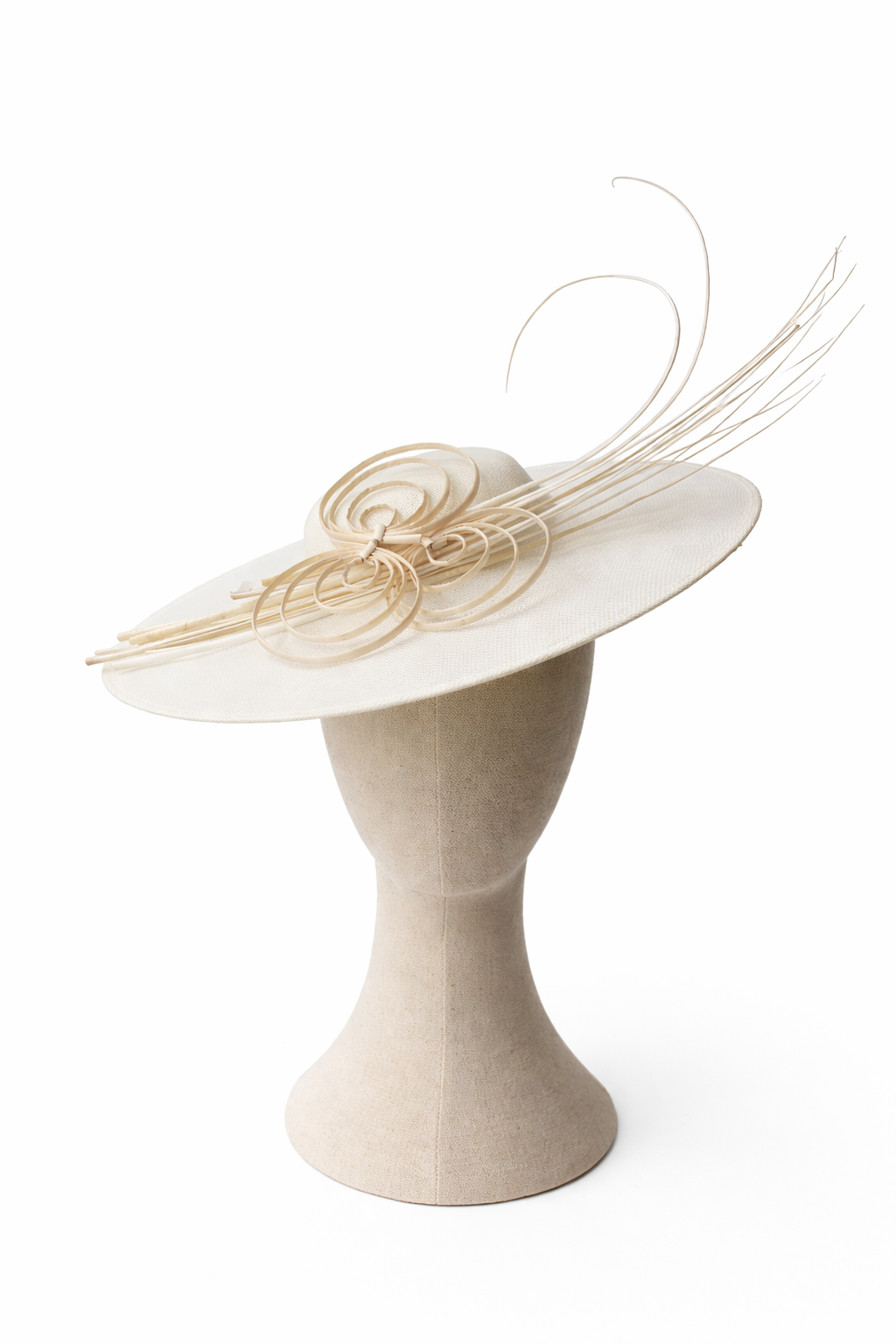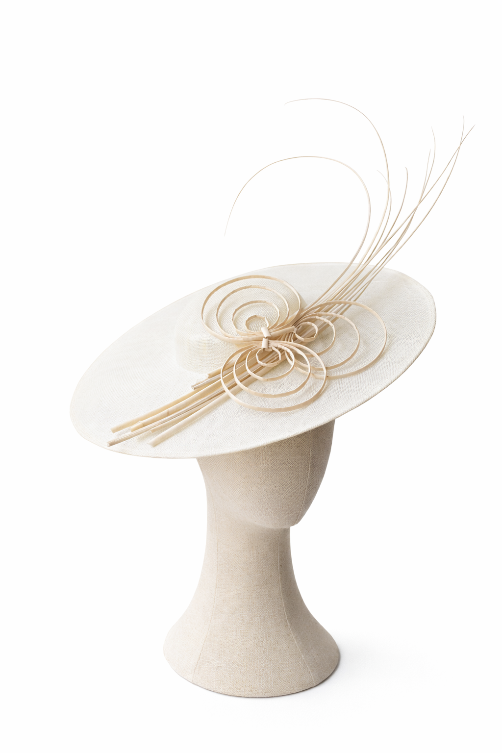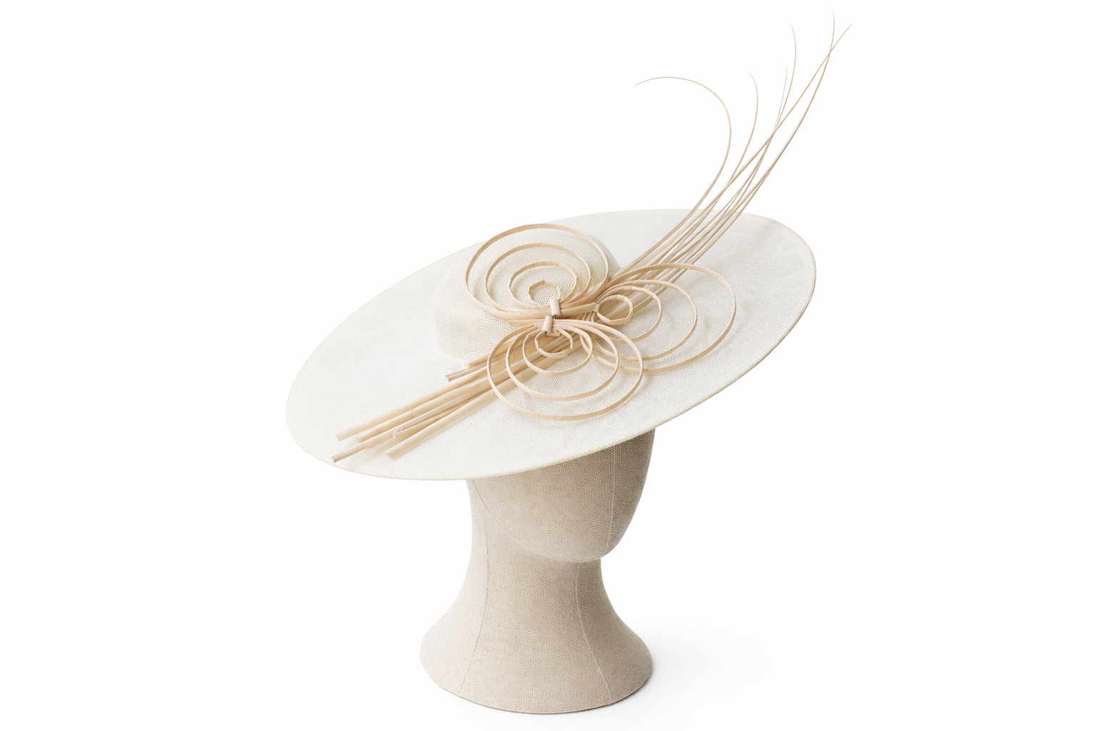 REF: 810269 – Precioso y elegante tocado de fiesta o pamela en tono marfil, confeccionada en sinamay ligero y decorada con un espectacular diseño escultural de lazadas y varillas que aportan movimiento y elegancia. Su composición artística la convierte en una pieza única, perfecta para bodas, ceremonias y eventos especiales donde quieras destacar con distinción. Refinada, luminosa y muy favorecedora, es el complemento ideal para invitadas que buscan un look elegante, moderno y con personalidad. Incluye diadema y horquillas para sujetarlo como más cómodo te resulte.