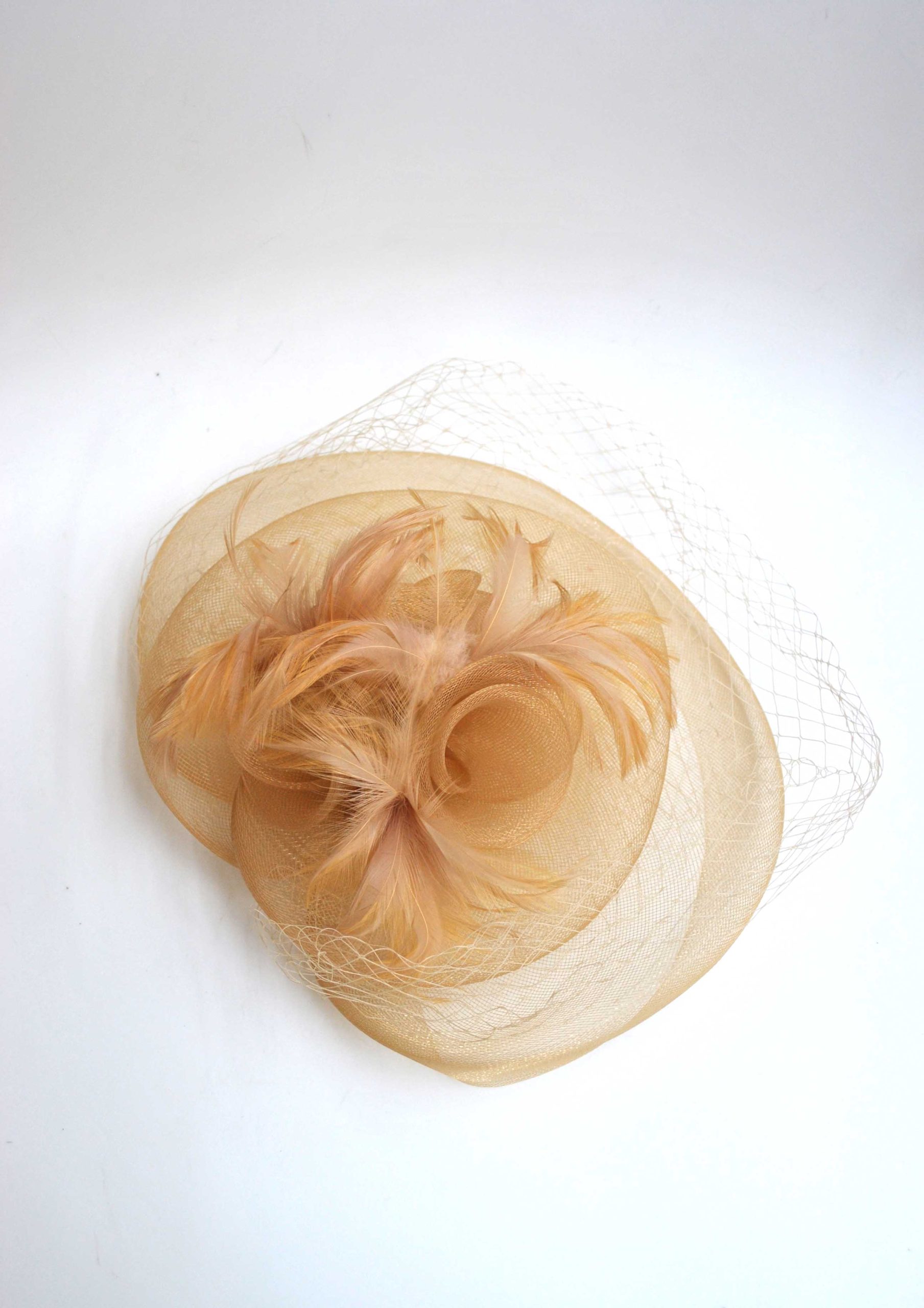 R04/5720 – Bonito y original tocado de fiesta en color dorado champagne con redecilla. Se trata de un tocado con la base confeccionado en una elegante tela de tul y decoraciones con vaporosas plumas del mismo tono. Lo puedes llevar cómodamente colocado gracias a una pinza o a una diadema. Queda espectacular y es muy cómodo de llevar, marca elegancia y estilazo con nuestra colección de tocados.