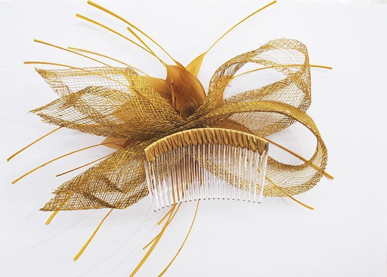 Tocado mediano confeccionado con plumas del revés, lazada en sinamay decorativa del mismo color formando una bonita flor, quedando un diseño elegante en color DORADO. Gracias a su forma y diseño, podrás hacer infinidad de combinaciones. Sujétalo cómodamente al pelo con peineta el más adecuado, porque no pesa y es muy fácil de colocar.