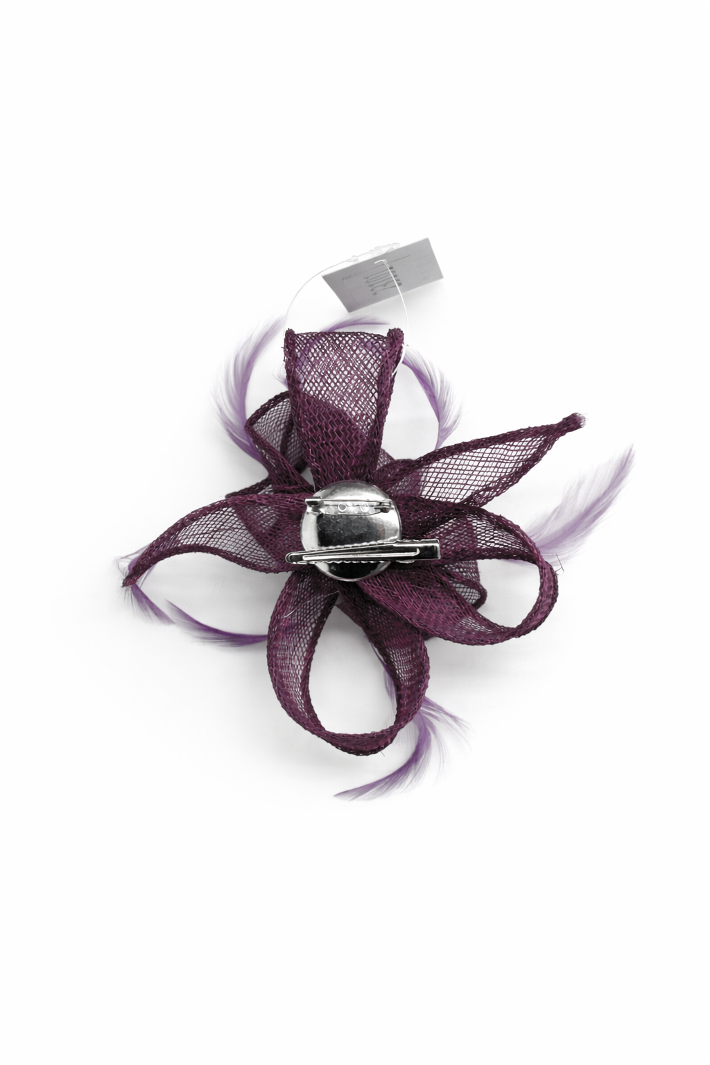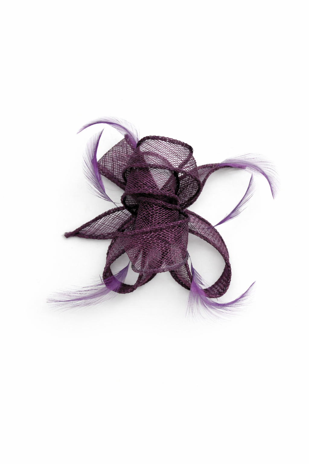 REF: 35999 – Preciosa flor tocado fabricado en sinamay de color morado berenjena. Está diseñado en forma de flor y presenta elegantes plumas vaporosas. Incluye pinza y broche para colocarlo como más cómodo te resulte.