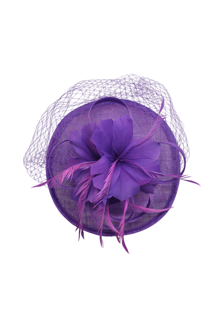 REF: 4707 – Bonito tocado de fiesta mediano, de color morado confeccionado con plumas formando un precioso ramillete de flores, sinamay y redecilla decorativa del mismo color, quedando un diseño elegante. Gracias a su forma y diseño, podrás hacer infinidad de combinaciones. Sujétalo cómodamente al pelo con diadema, porque no pesa y es muy fácil de colocar.