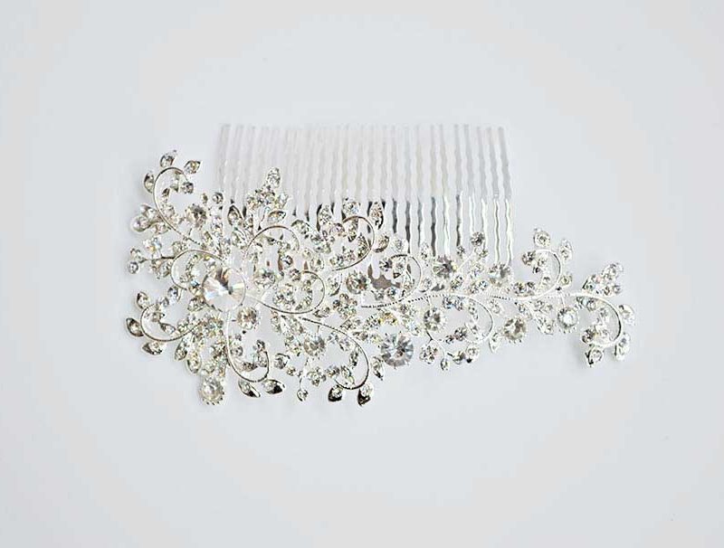 R03/5029 – Preciosa y elegante peineta plateada grande o tocado para pelo diseñada con ramilletes de hojas y cristales blancos. Perfecta para cualquier recogido en aquellas bodas y eventos especiales.