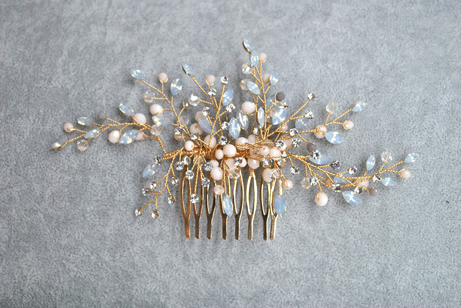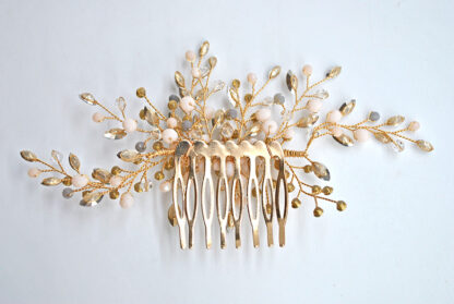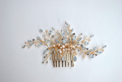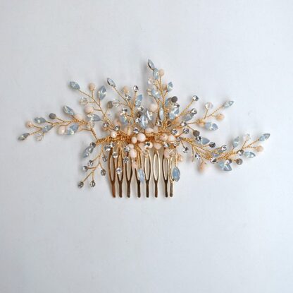 R03/5260 – Elegante y bonita peineta de fiesta. Se trata de una peineta realizada en metal ligero dorado y decorada con pequeñas bolitas rosa nude y combinadas con cristales azul cielo y cristales blancos. Muy versátil ya que se puede moldear y adaptar a tu recogido o semirecogido. Es perfecta para que luzcas como la novia o la madrina ideal.