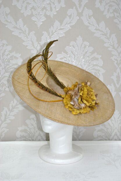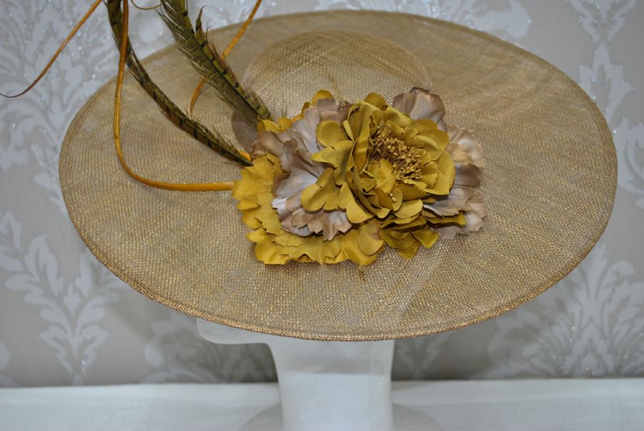Precioso tocado personalizado de fiesta de bodas, realizado con plato en color dorado fabricado en sinamay y decorado con flores doradas y mostazas con algún que otro reflejo blanco. Además presenta una elegante pluma de faisán y dos raquis. Además, lleva pinza o diadema para sujetarlo al pelo más cómodamente.