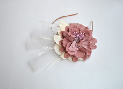 R03/5244 – Precioso tocado pequeño. Se trata de un tocado de niña sujeto con una diadema metálica en color oro rosa. Presenta un pequeño casquete de paja en color rosa empolvado y está decorado con una flor rosa empolvado y una en blanco crudo. Además destaca una bonita lacería blanca.