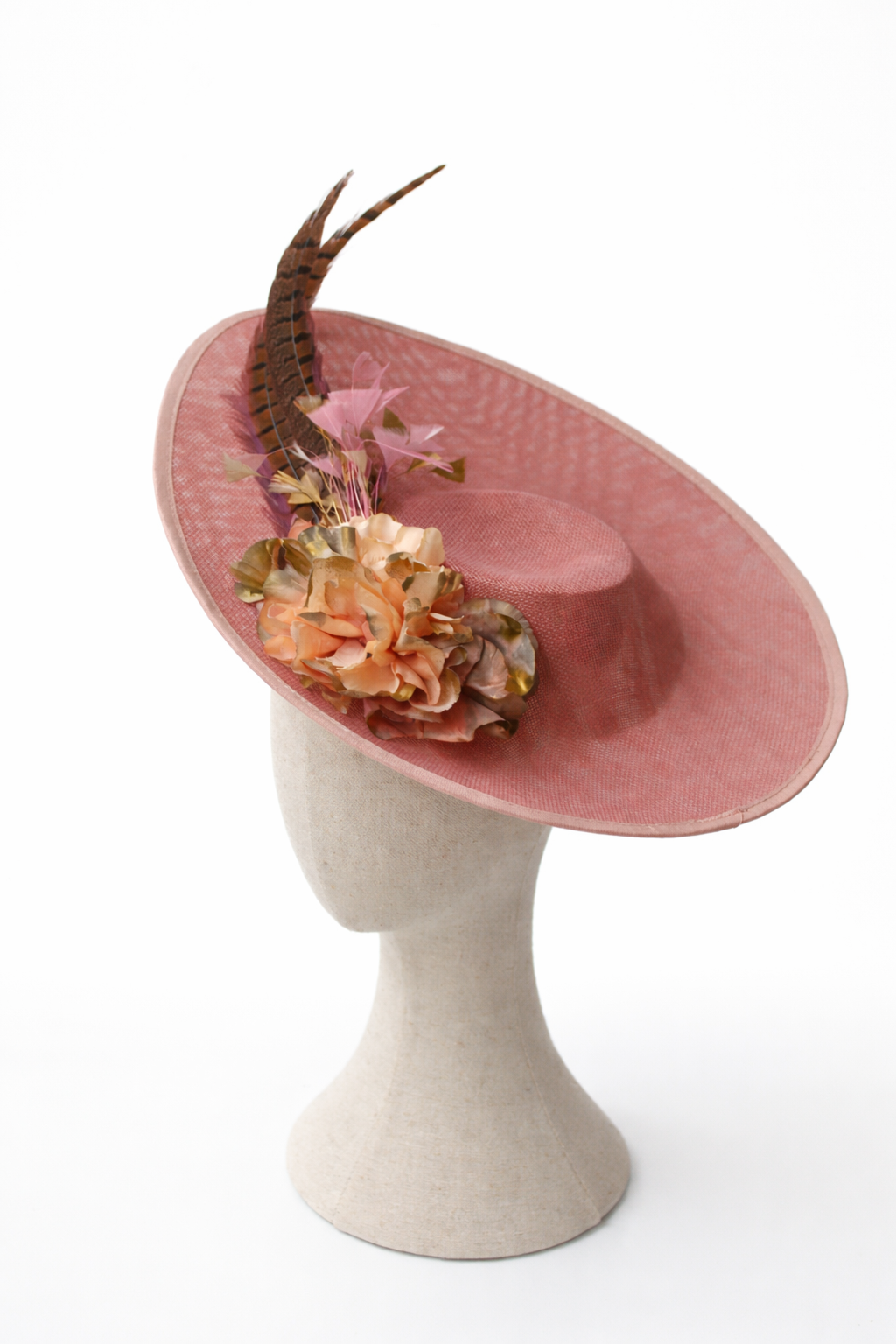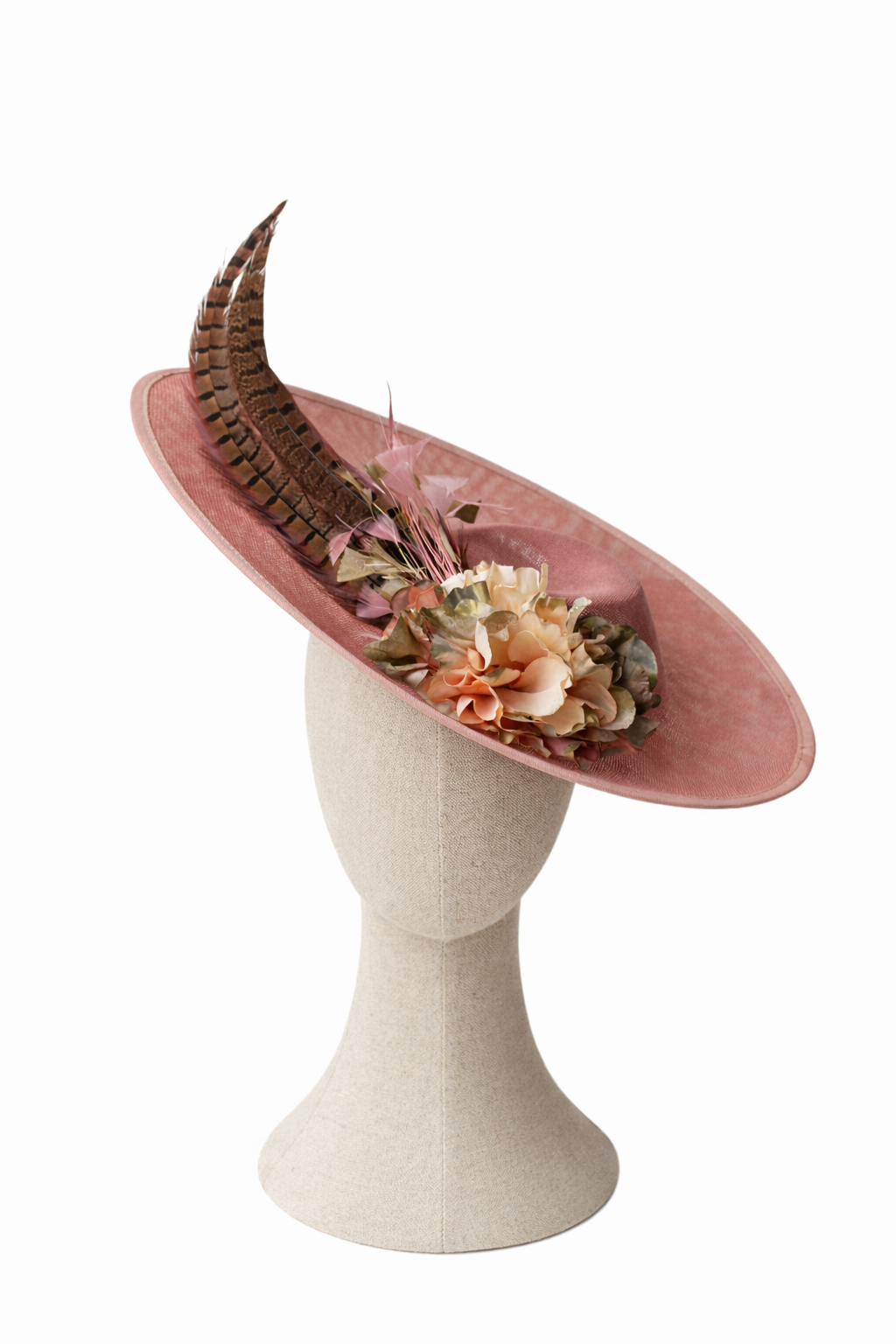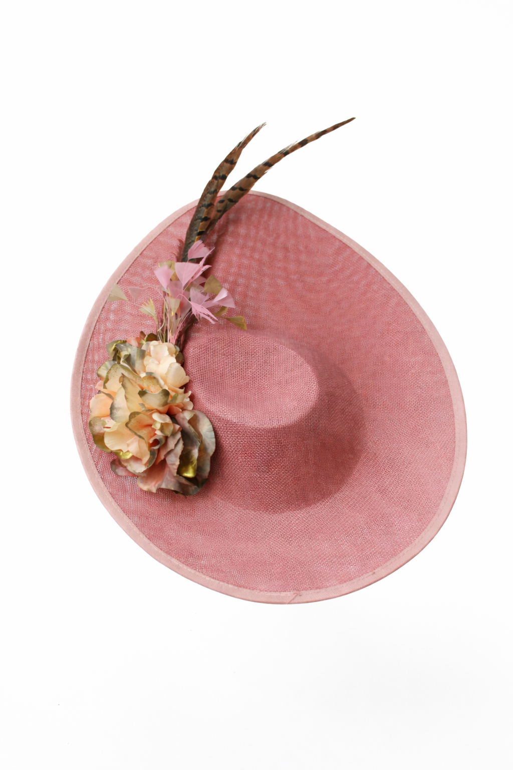 REF: 902368 – Precioso tocado de fiesta ideal para madrinas e invitadas de boda, confeccionado en tono rosa empolvado, decorada con un elegante conjunto floral en tonos melocotón y verde suave, acompañada de plumas naturales que aportan altura y movimiento. Su ala amplia estiliza el rostro y convierte este tocado en el complemento perfecto para bodas, eventos y celebraciones especiales. Femenina, sofisticada y muy favorecedora, es una pieza ideal para invitadas que buscan un look elegante con un toque romántico y distinguido. Incluye diadema y horquillas para colocarlo como más cómodo te resulte.