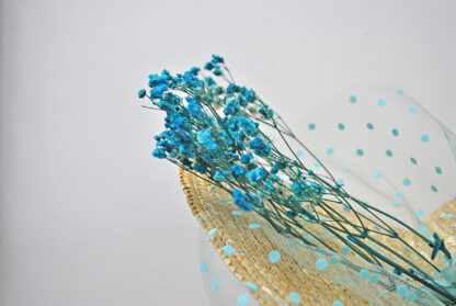 R03/5239 – Maravilloso tocado grande de fiesta en color TURQUESA. Se trata de un tocado con la base confeccionada en paja y decorada con una flor del mismo tono, con redecilla y pequeños lunares turquesas. Además, destacan pequeños ramilletes de florecitas preservadas también en un llamativo y bonito color azul turquesa. Incluye diadema y pinzas para llevarlo cómodamente sujeto.